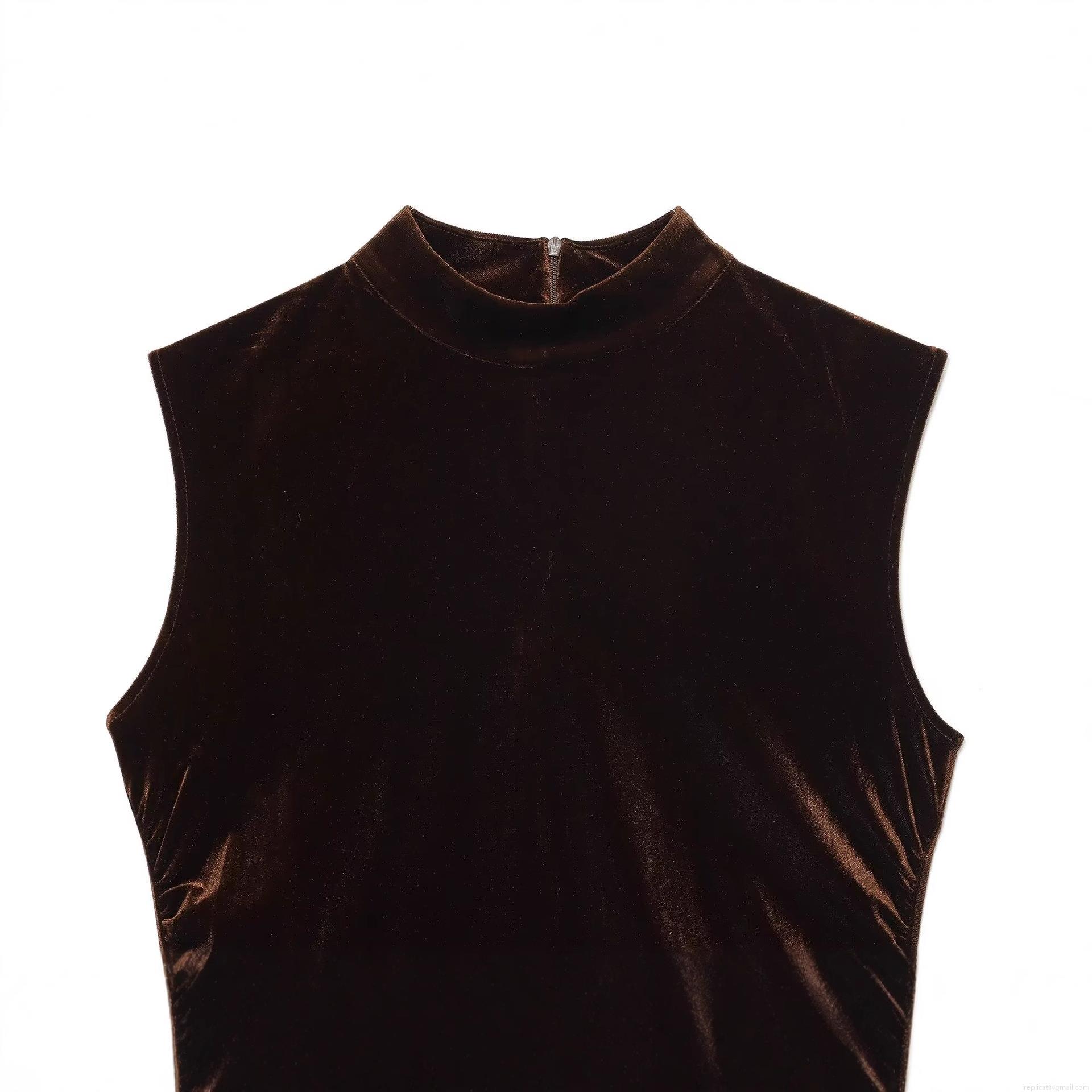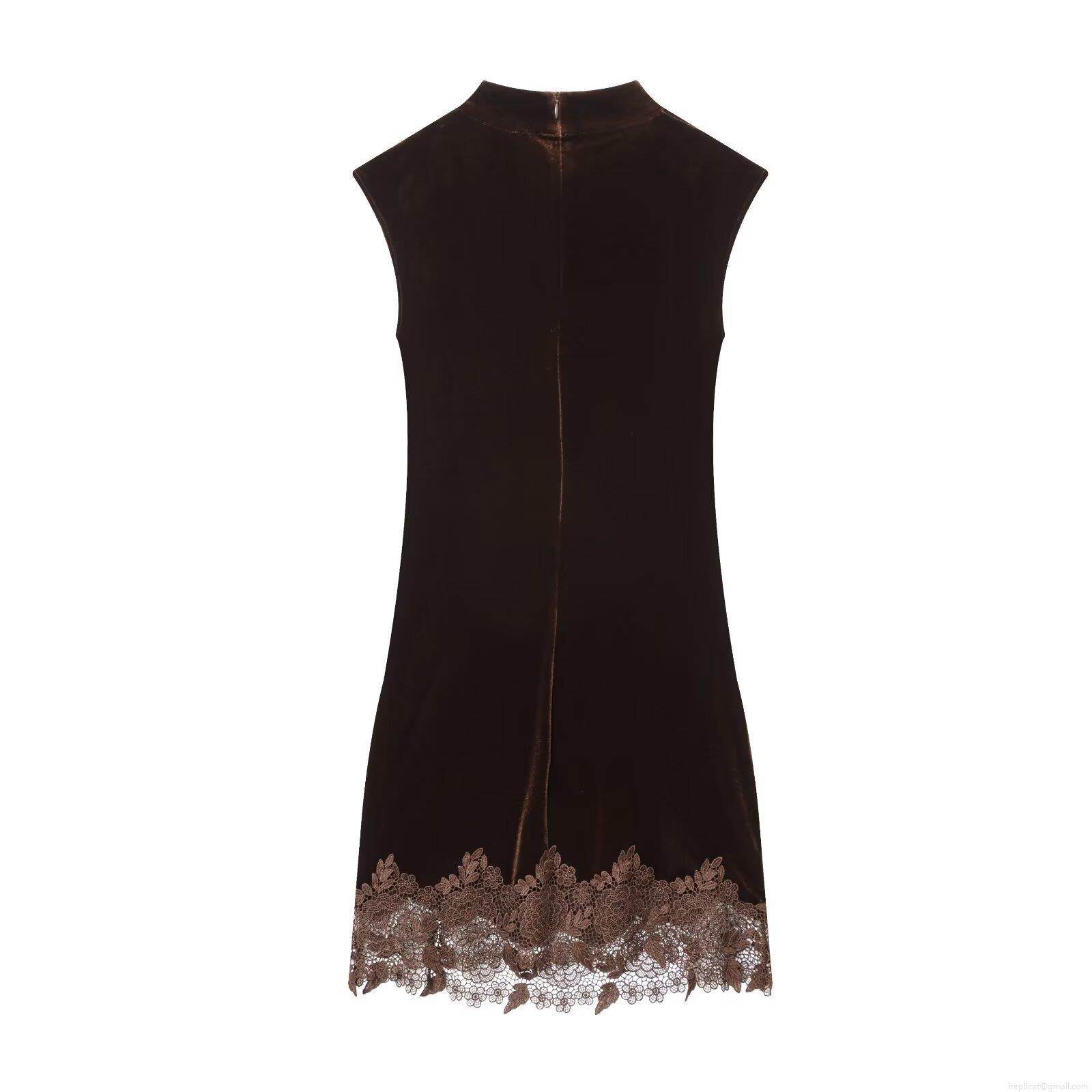 Women's Sleeveless Velvet Mini Dress Featuring Lace Trim Hem And Ruched Bodycon Design Mock Neck Coffee Brown Sexy Elegant Party Socialite Clubwear Dress