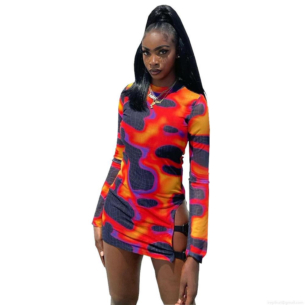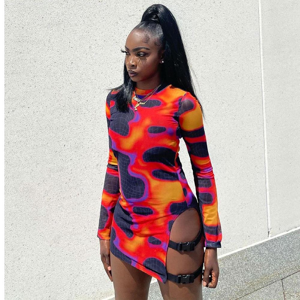 • Women's Slim Fit Flame Print Long Sleeve Mini Dress With Side Cutout Buckle Decoration Sexy Streetwear Bodycon Clubwear Party Dress