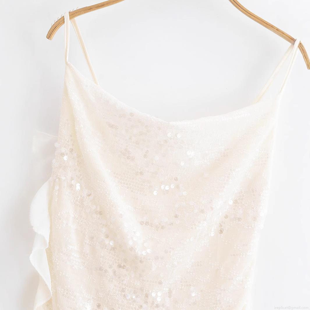 • Women's Spaghetti Strap Sequin Mini Dress With Ruffle Side Sparkly Sleeveless Party Club Cocktail Bodycon Dress For Women Beige