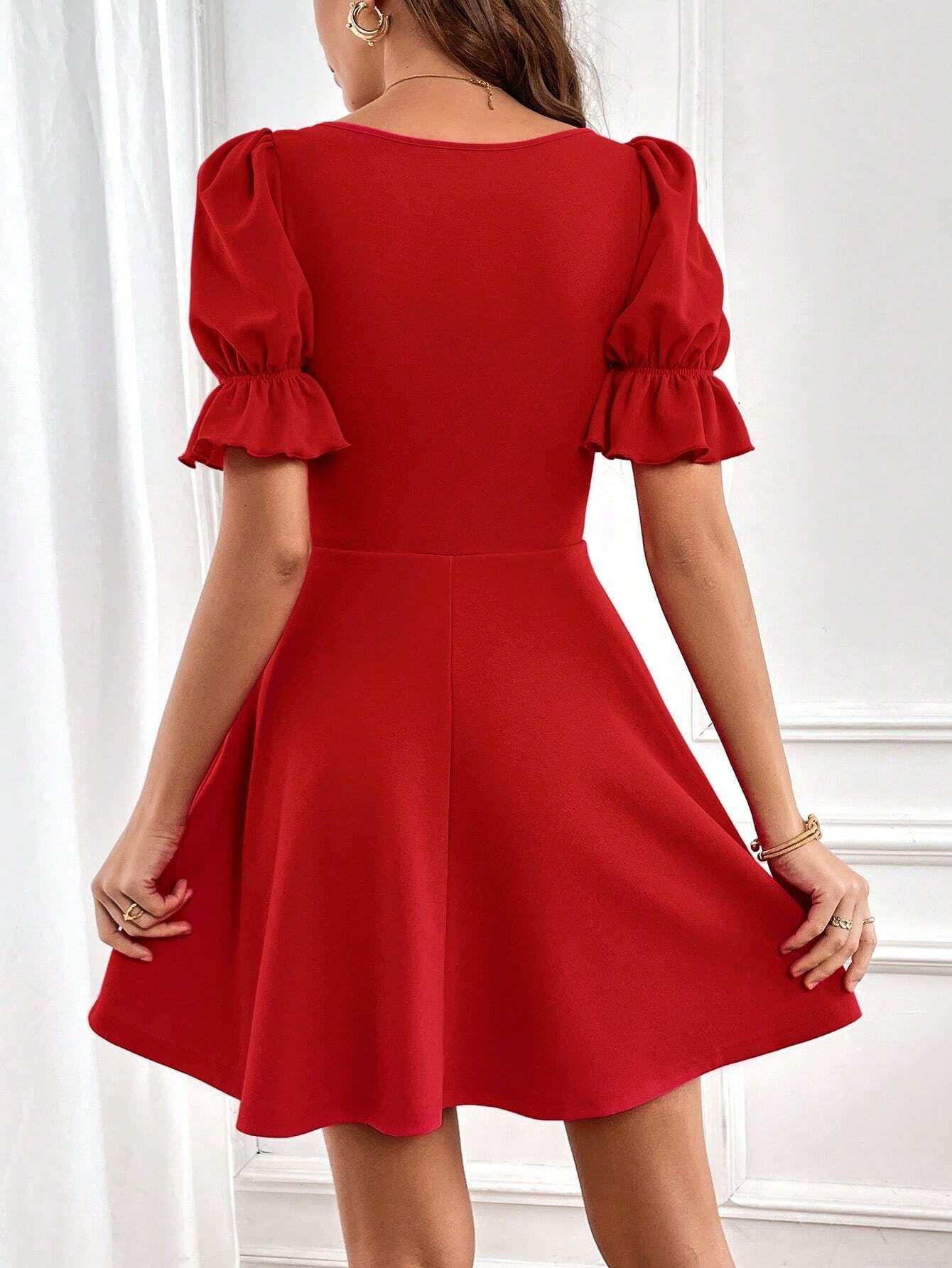 • Women's Square Neck Puff Sleeve Mini Dress Knit Polyester Elastane Solid Color Ruffle High Waist A-Line Dress For Summer Casual Party