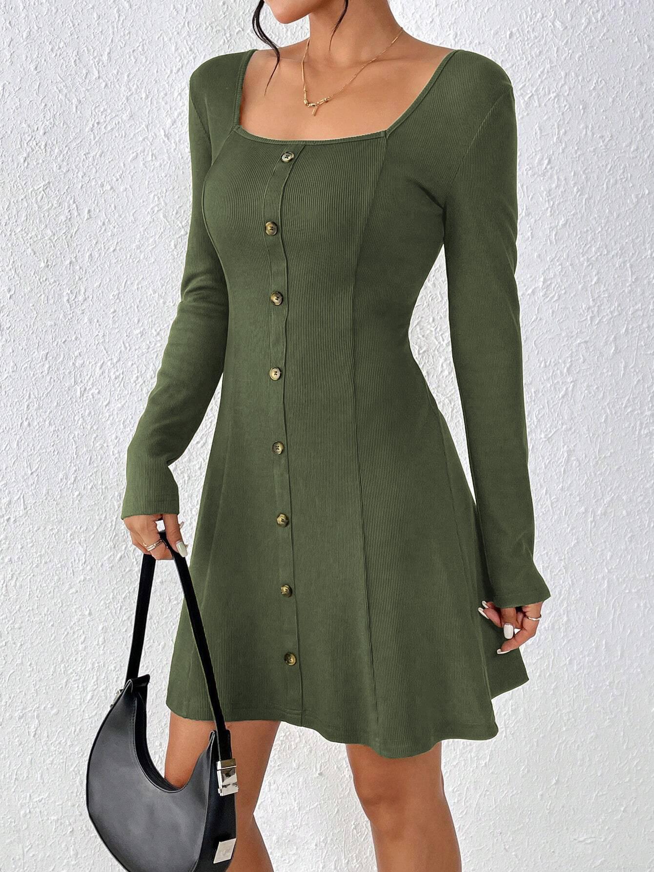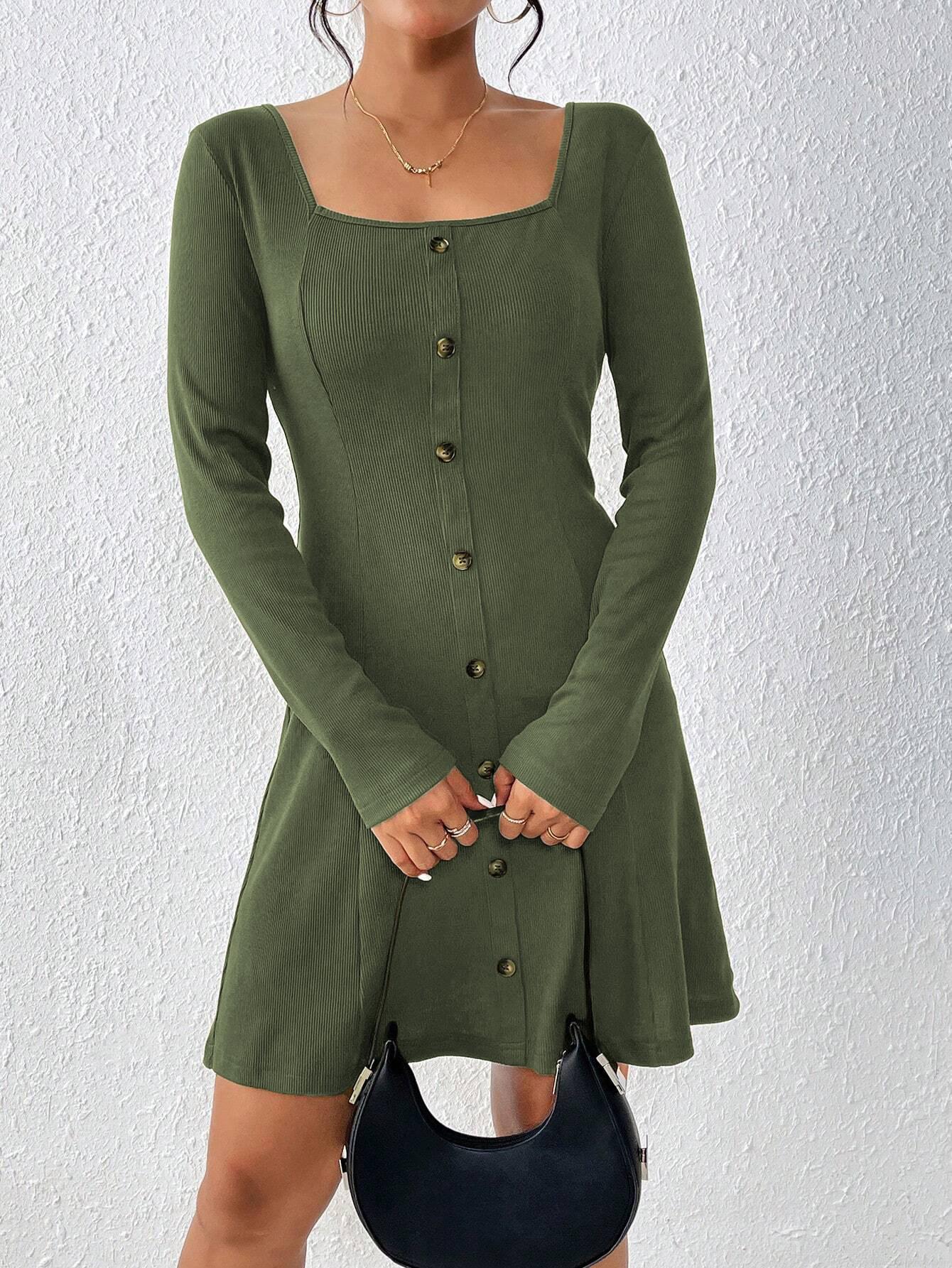 • Women's Square Neck Ribbed Knit Dress Long Sleeve Button Decor Slim Fit Mini A-Line Dress For Autumn Winter Elegant Army Green Polyester Elastane Dresses