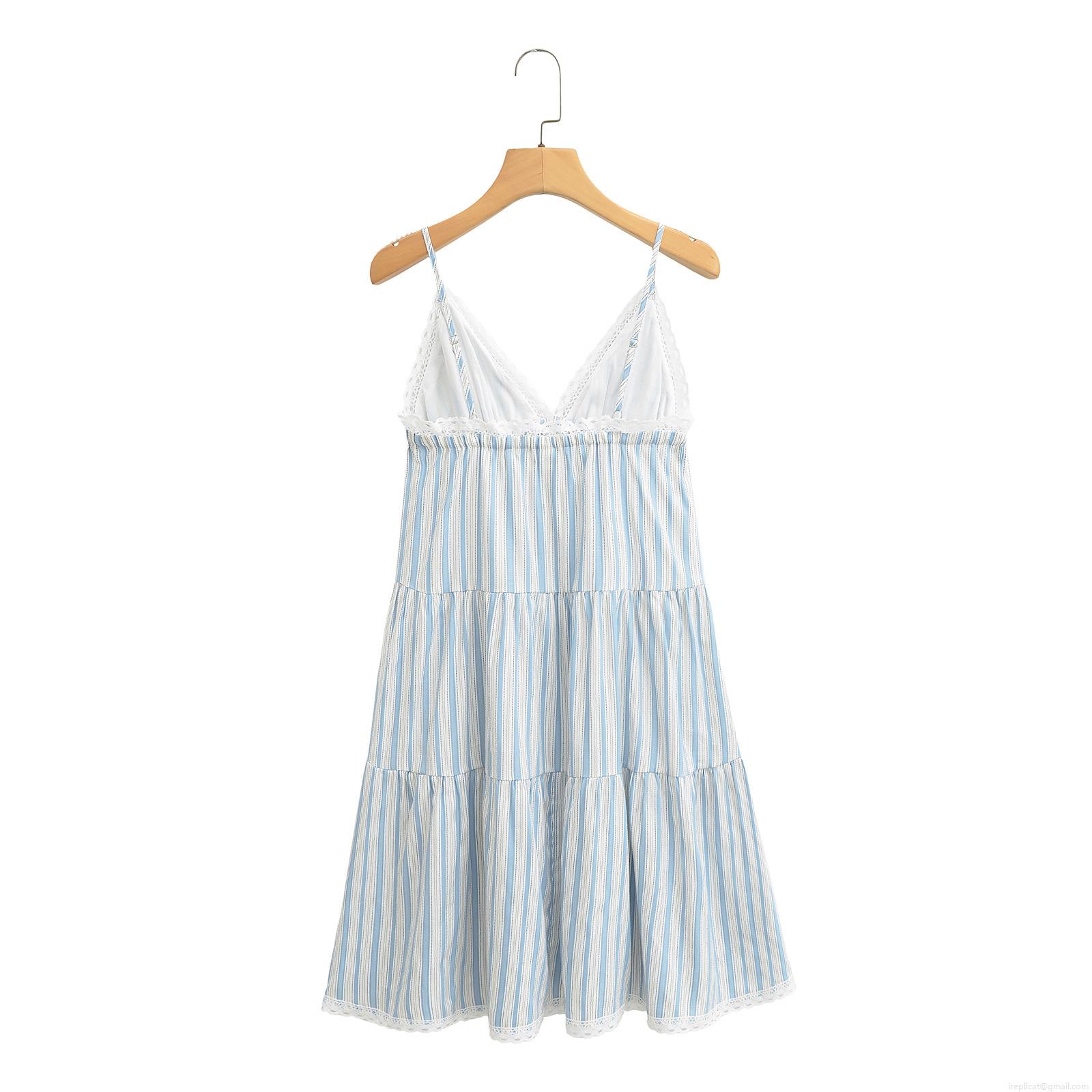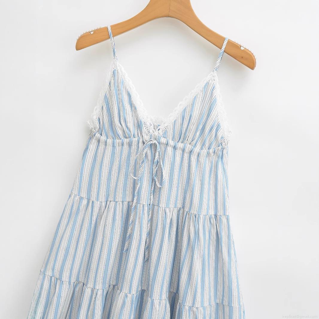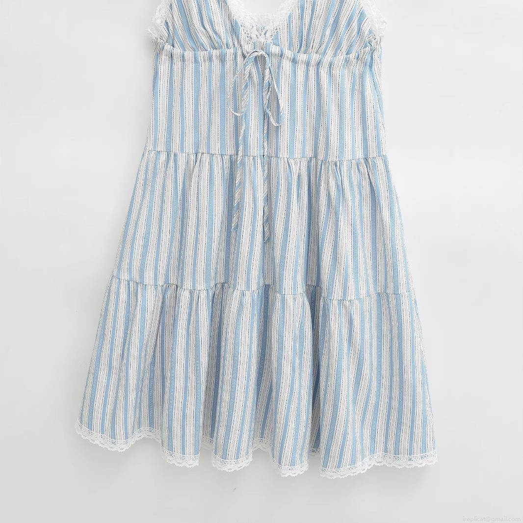 • Women's Summer 100% Cotton Camisole Dress Blue White Striped Lace Trim Tiered Mini Dress V-Neck Bow Tie Vacation Sweet Elegant Sleeveless Sundress