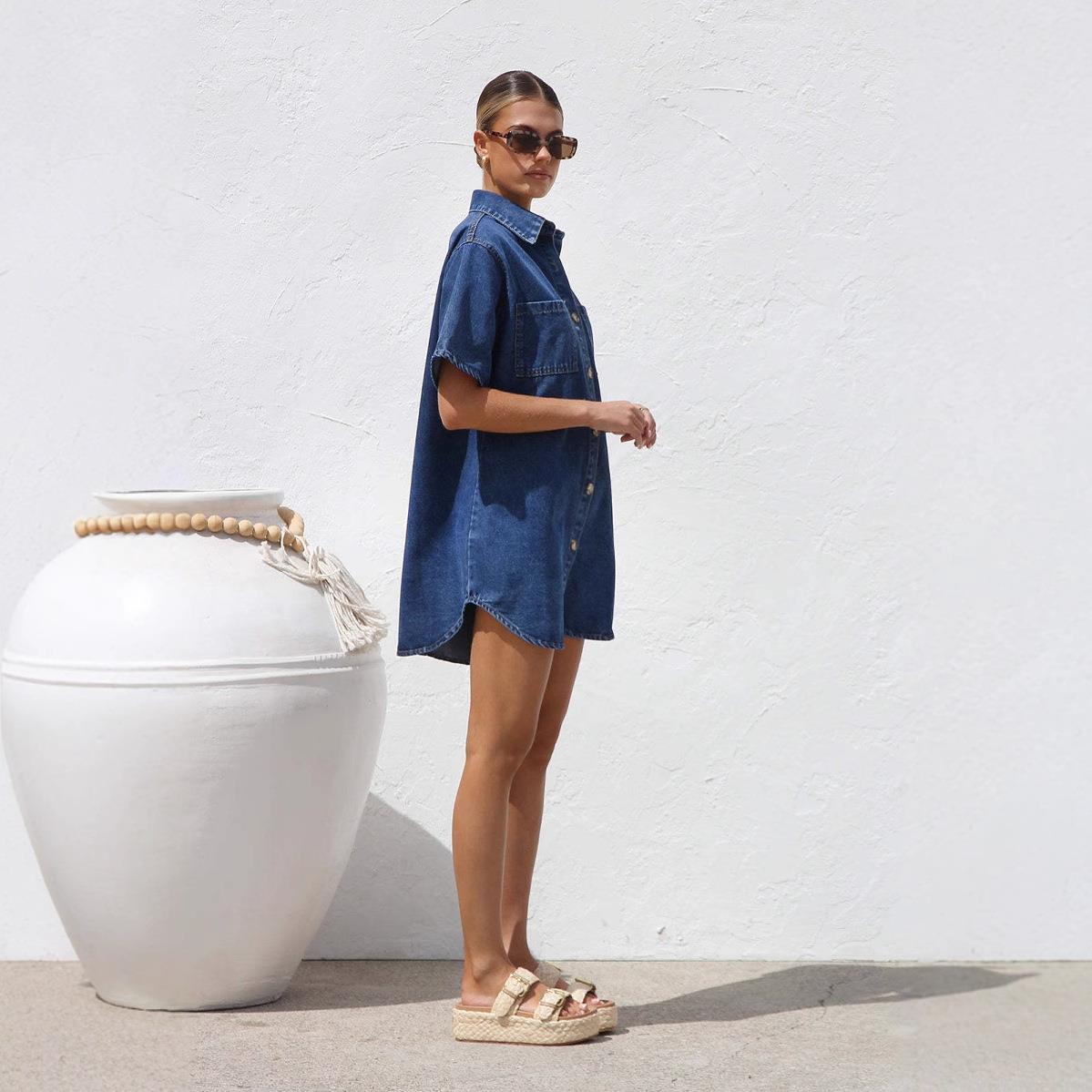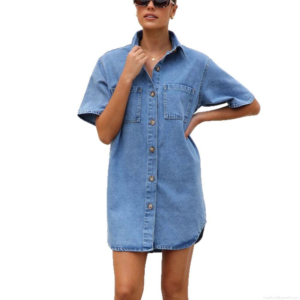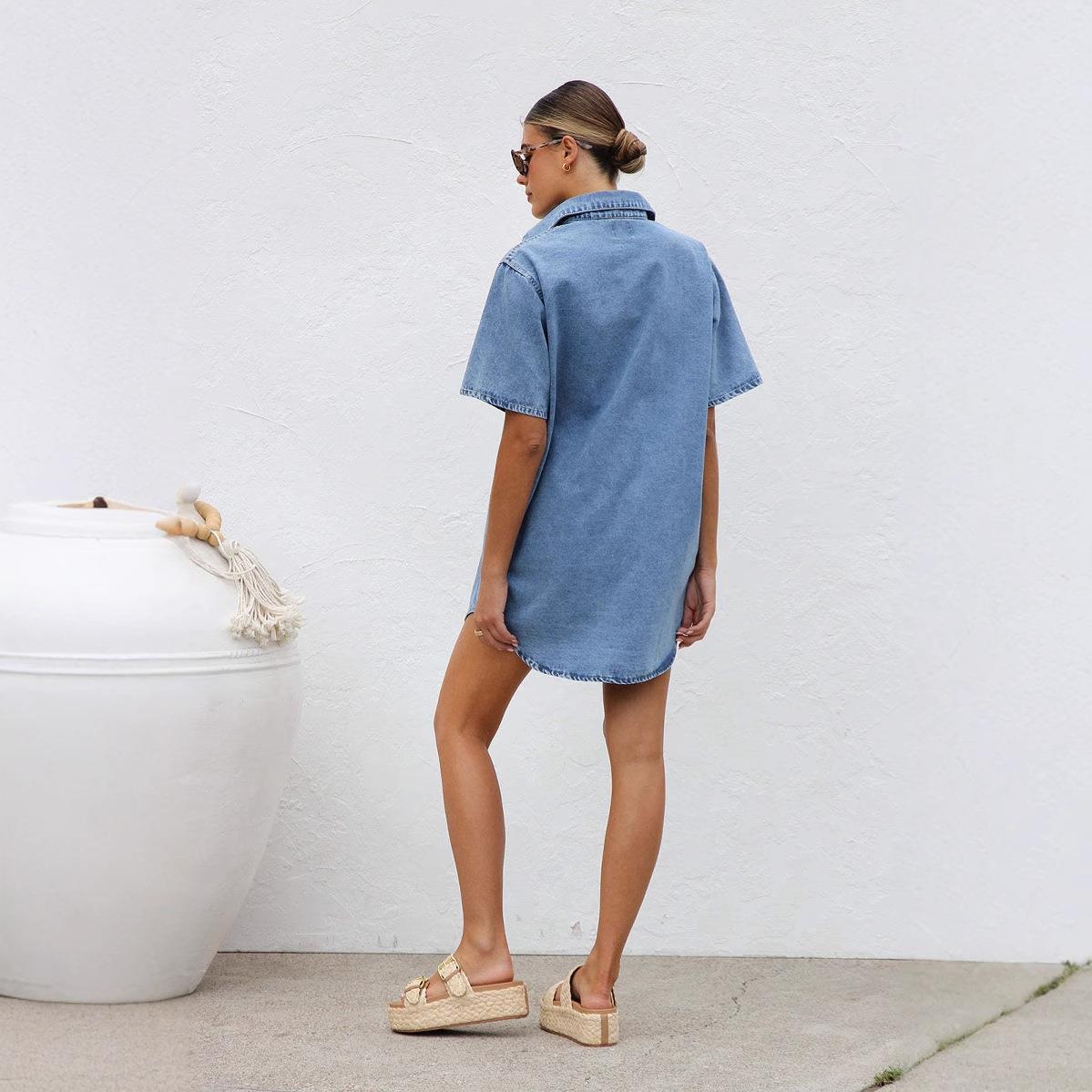 • Women's Summer Casual Denim Shirt Dress Short Sleeve Button Down Loose Mini Dress with Double Chest Pockets Polyester Denim Solid Color Streetwear