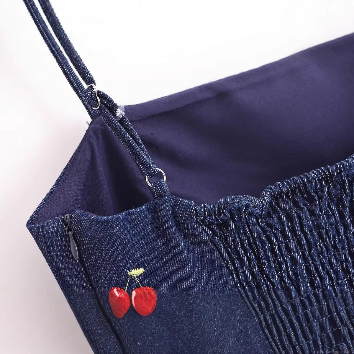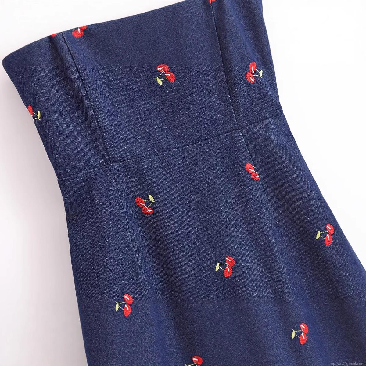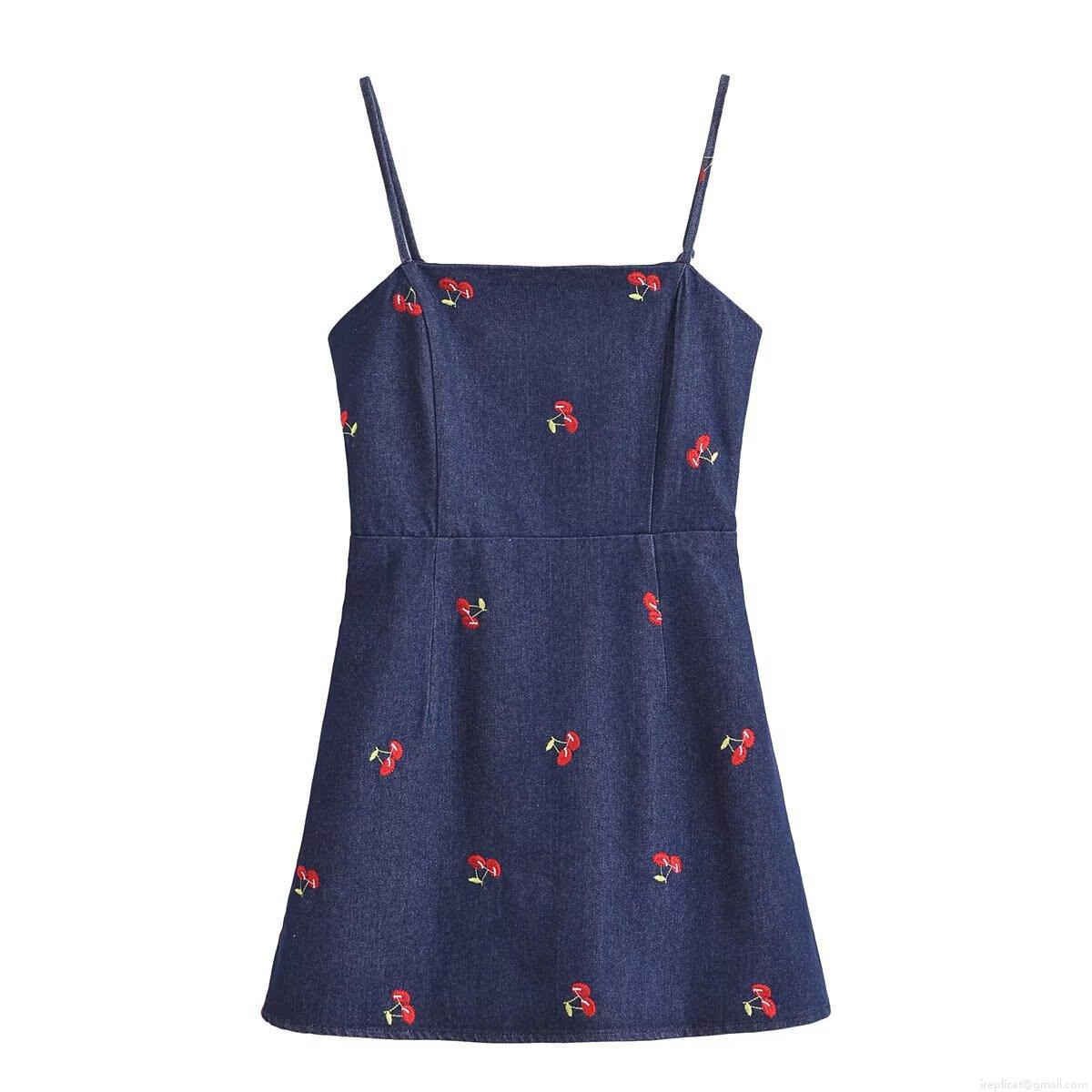 • Women's Summer Deep Blue Denim Fabric Mini Dress With Red Cherry Embroidery Backless Slim Fit Sleeveless Cami Dress For Casual Party Vacation