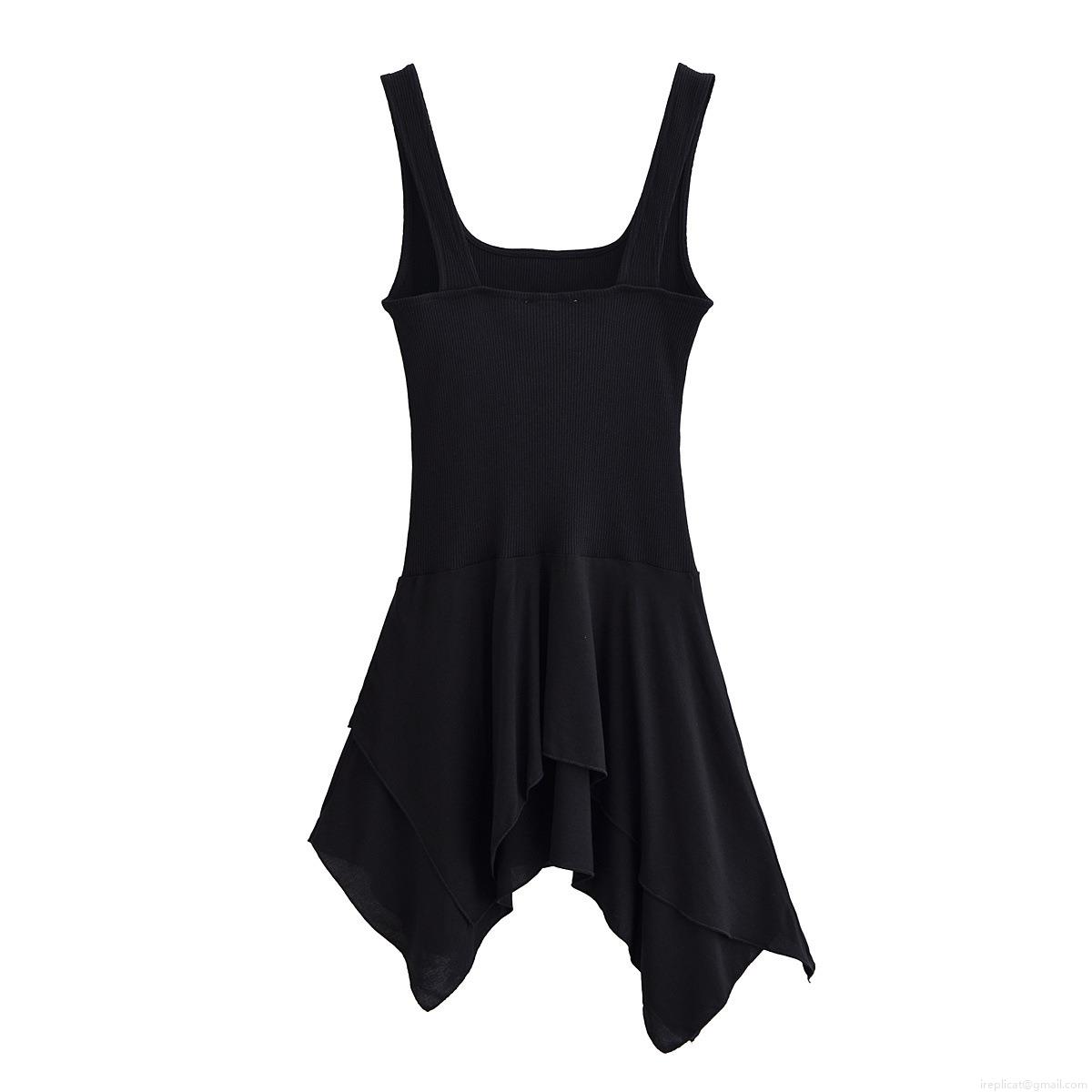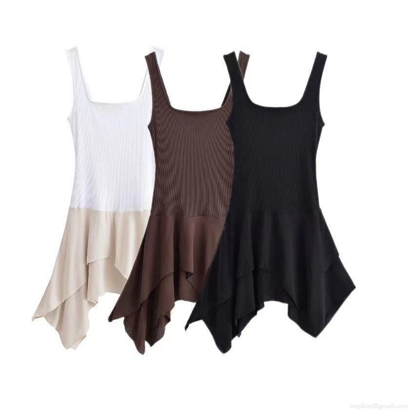 • Women's Summer Elegant Ribbed Knit Chiffon Patchwork Mini Dress Square Neck Broad Strap Asymmetrical Layered Ruffle Sleeveless Party Dress