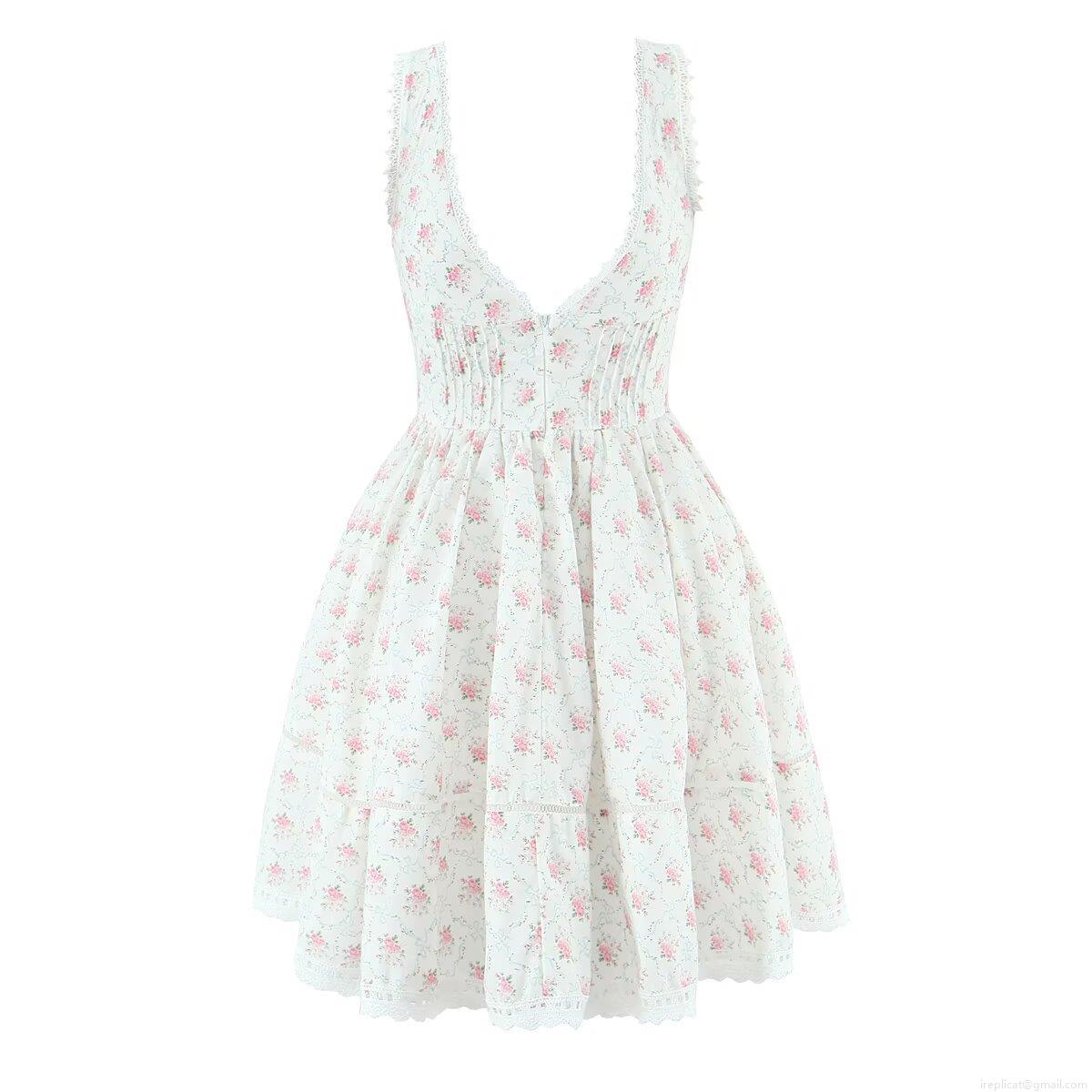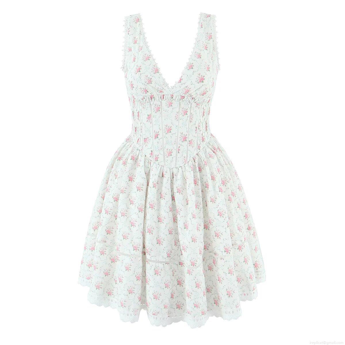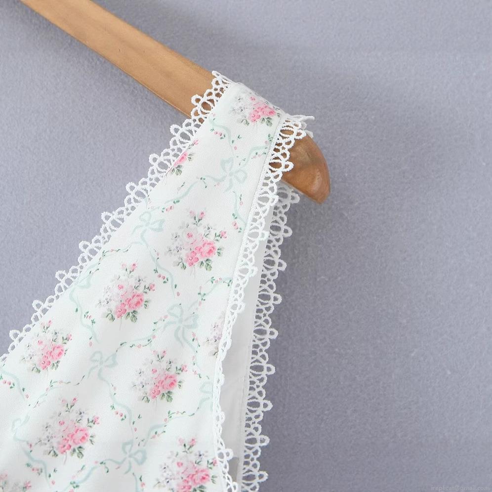 • Women's Summer Floral Print V-Neck Sleeveless Mini Dress With Lace Trim Nylon Elastane Fabric Elegant Waist-Cinching A-Line Cottagecore Party Dress