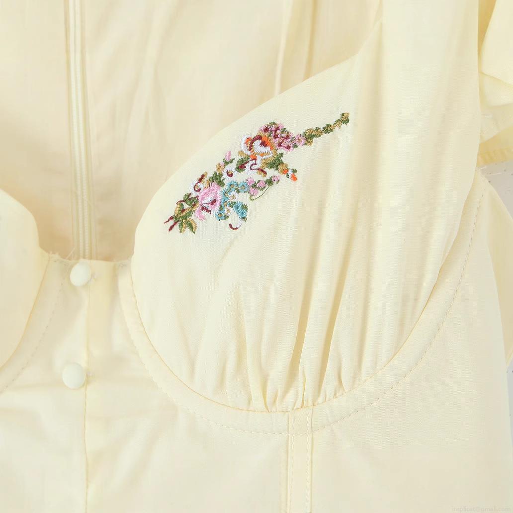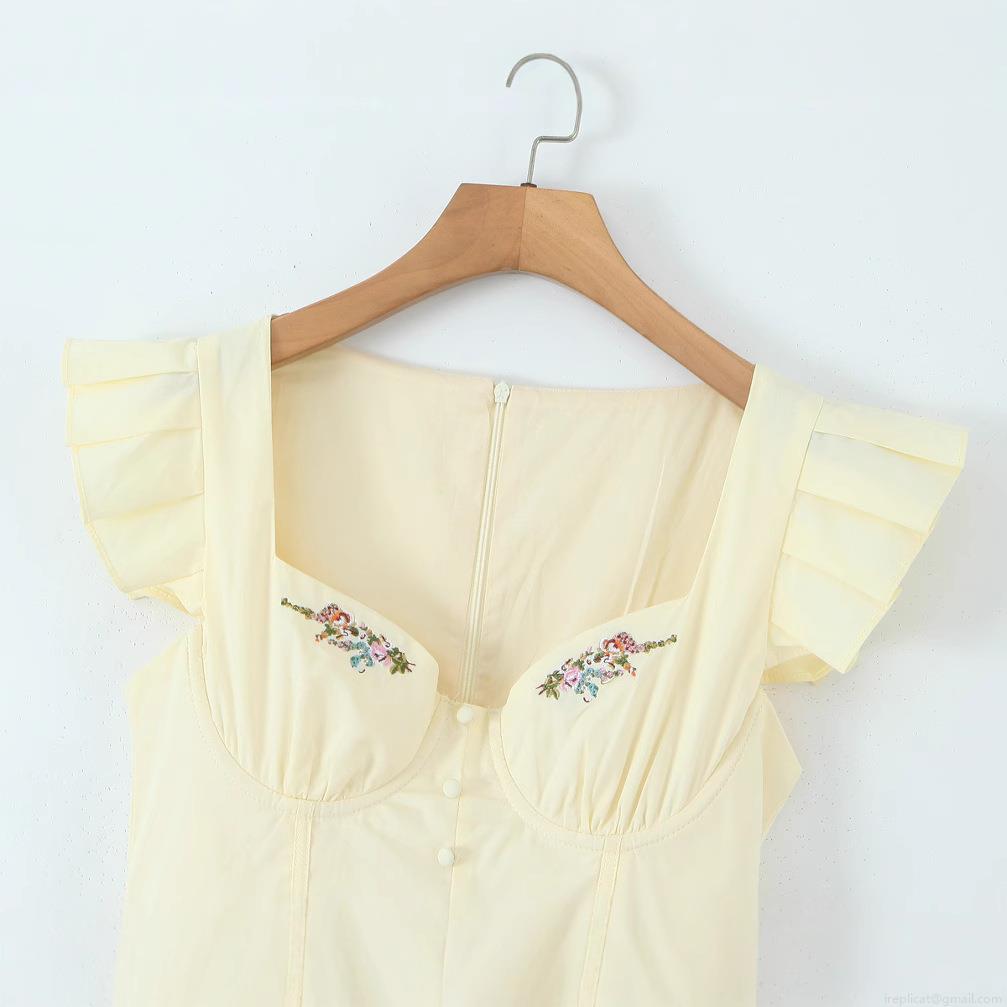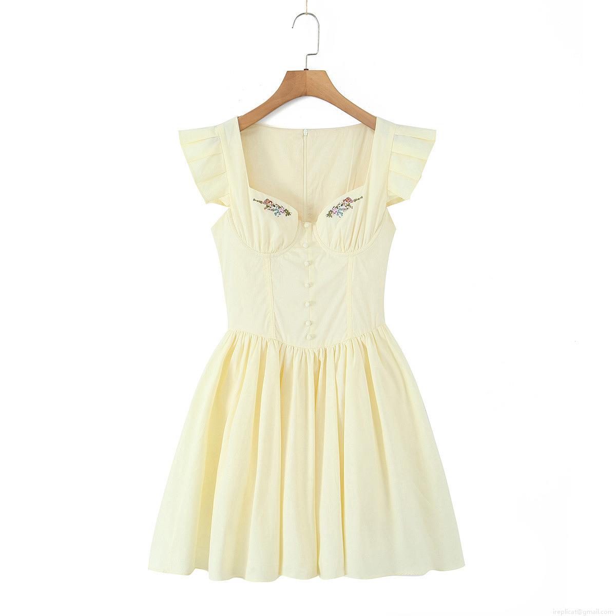 • Women's Summer French Vintage Square Neck Fly Sleeve Dress Floral Embroidery Pleated Cotton Blend Mini Dress For Casual Party Dating Yellow