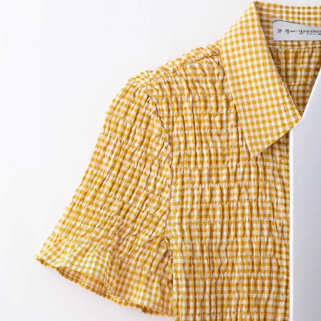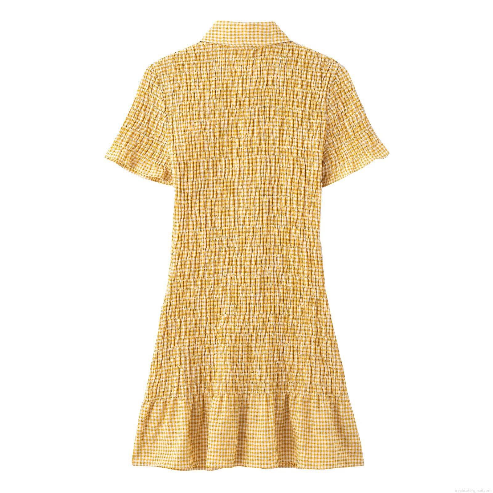 • Women's Summer Gingham Mini Dress Smocked Short Sleeve Button Up Collar Ruffle Hem Chic Elegant Plaid Polyester Casual Sun Dress