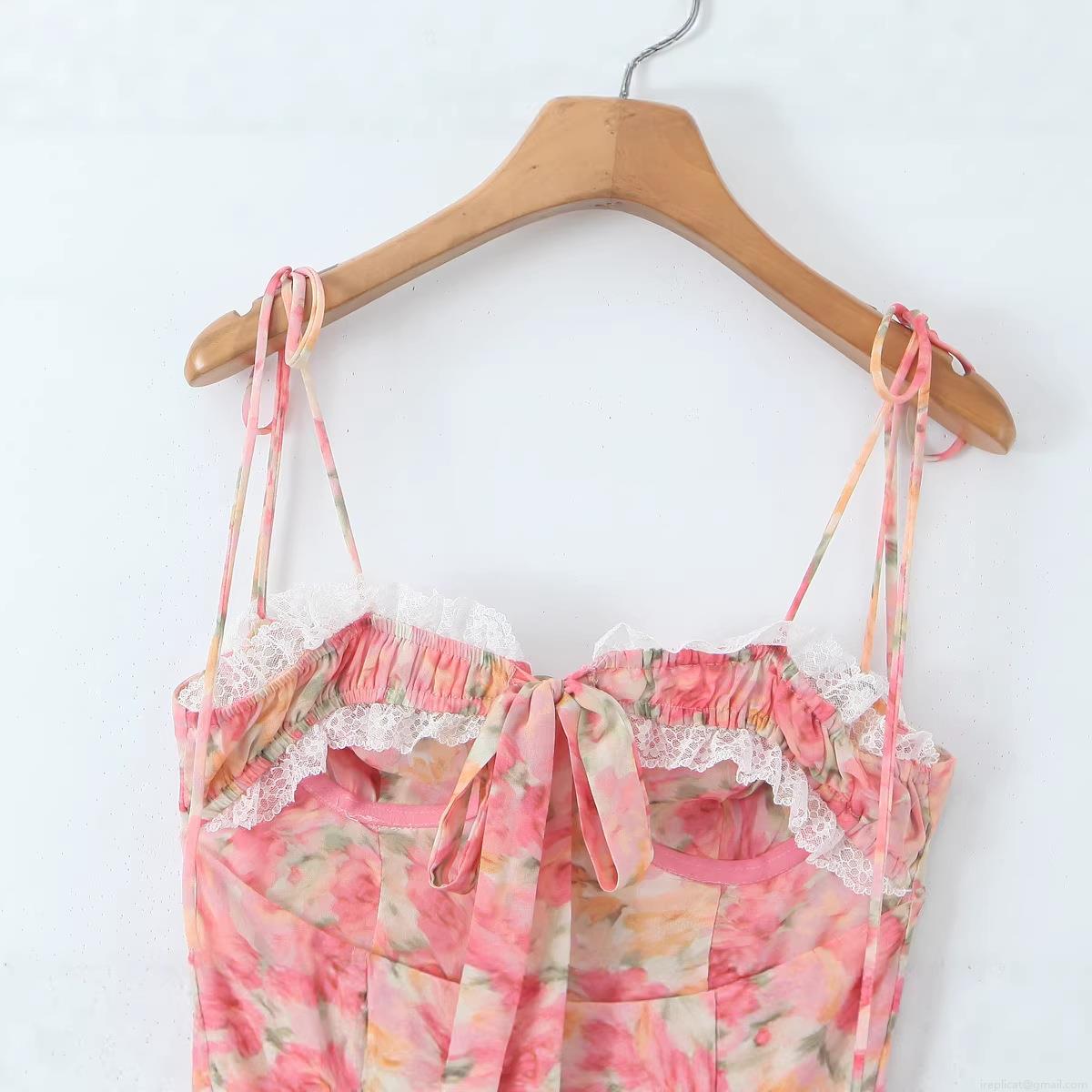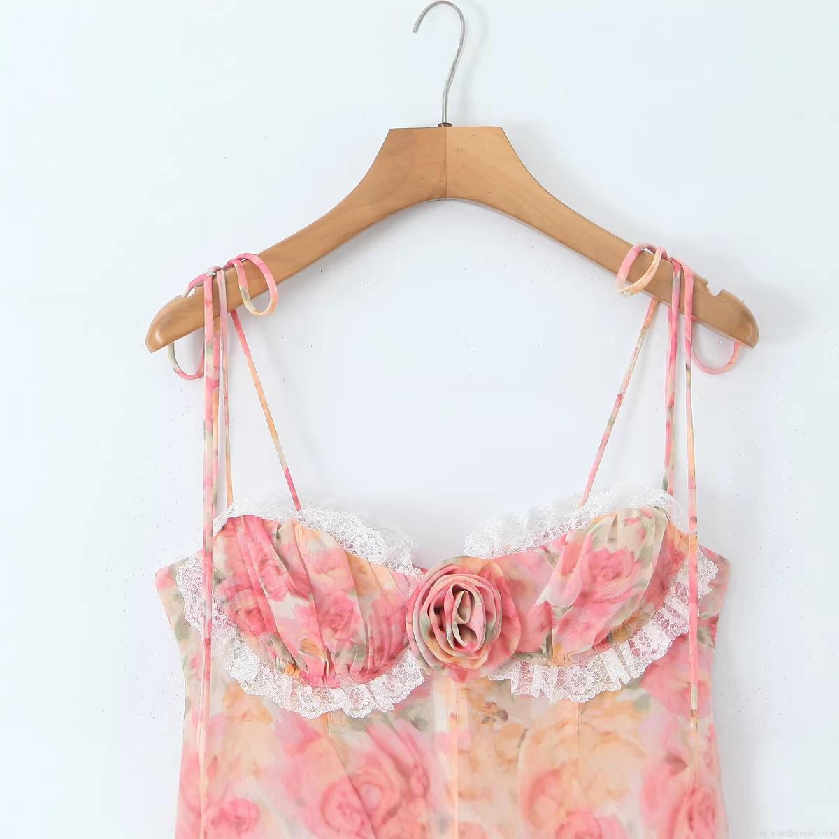 • Women's Summer Pink Floral Cami Dress With White Lace Trim And 3D Rose Decoration Irregular Hem Sleeveless Sweet Chiffon Feel Mini Dress For Vacation Party