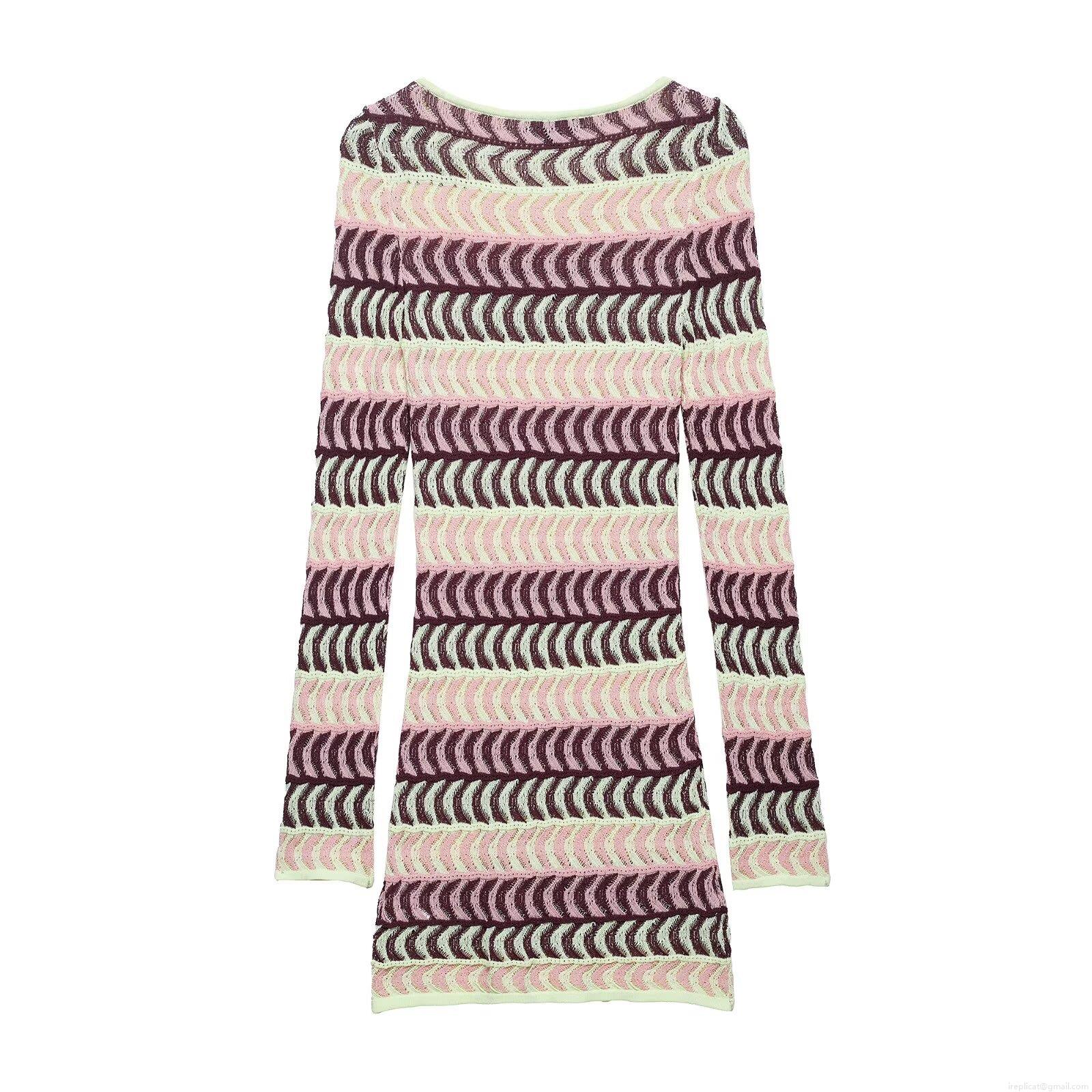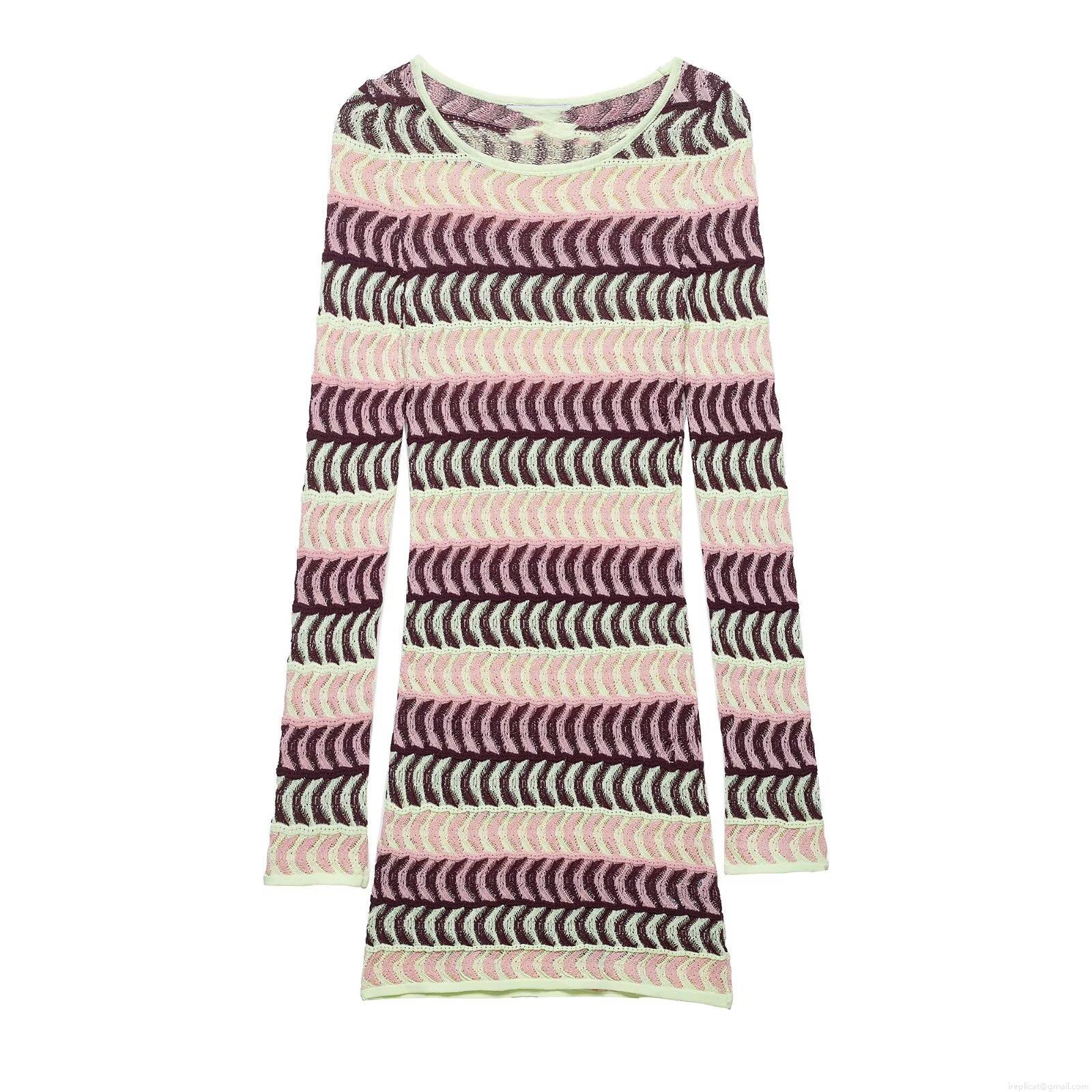 • Women's Summer Round Neck Long Sleeve Wave Striped Knitted Bodycon Mini Dress Multi-color Contrast Vacation Slim Fit Elegant Knit Dress