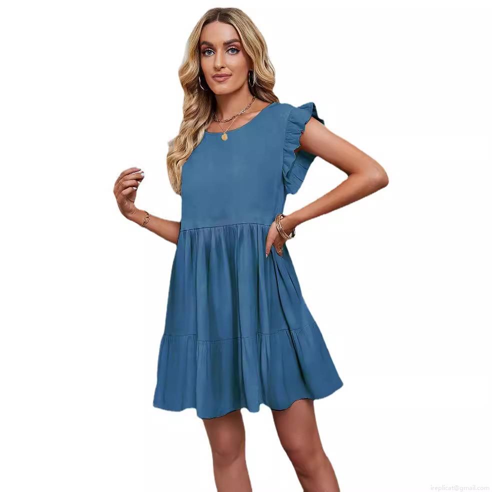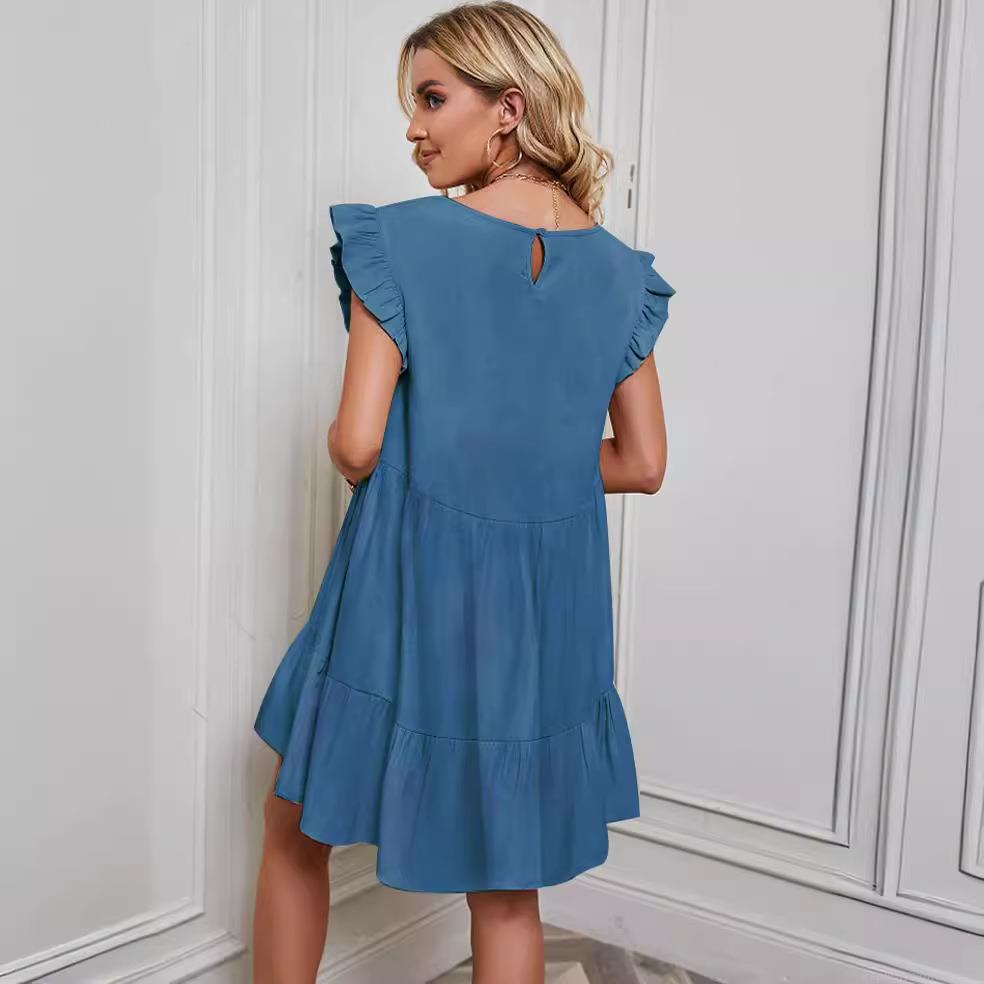 • Women's Summer Ruffle Sleeve Polyester A-Line Dress Tiered Mini Cake Dress Solid Color Casual Short Sleeve Round Neck Dress for Women Ladies