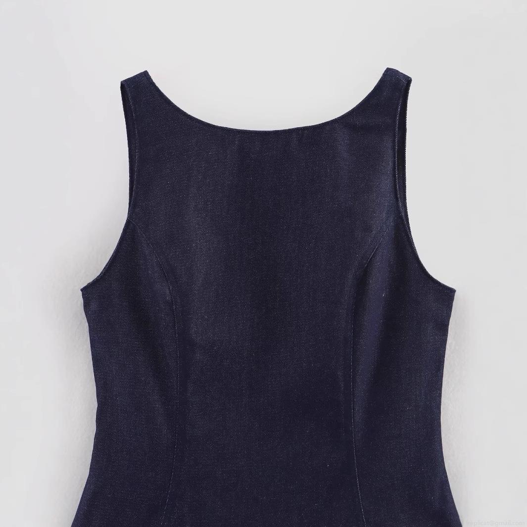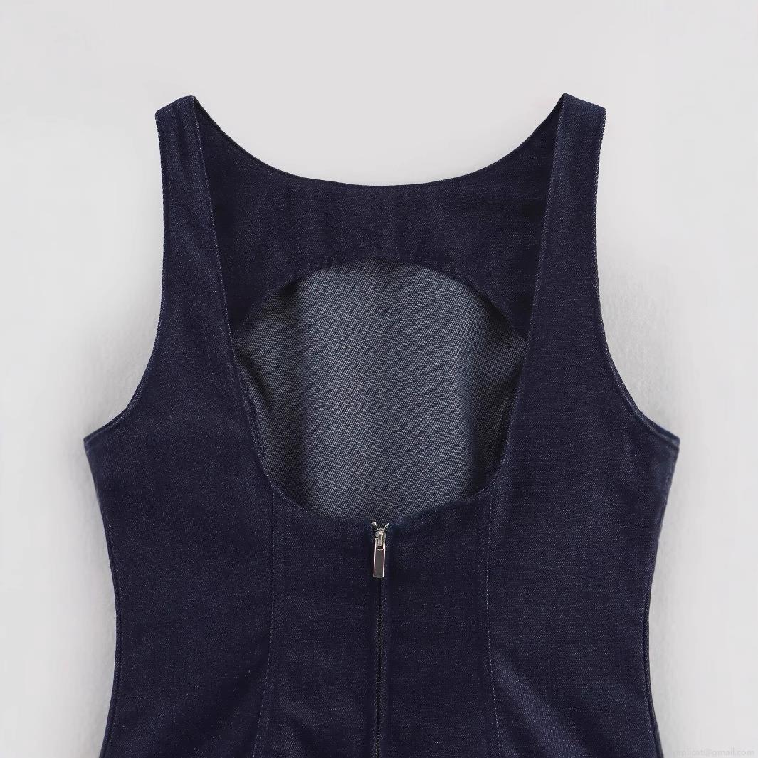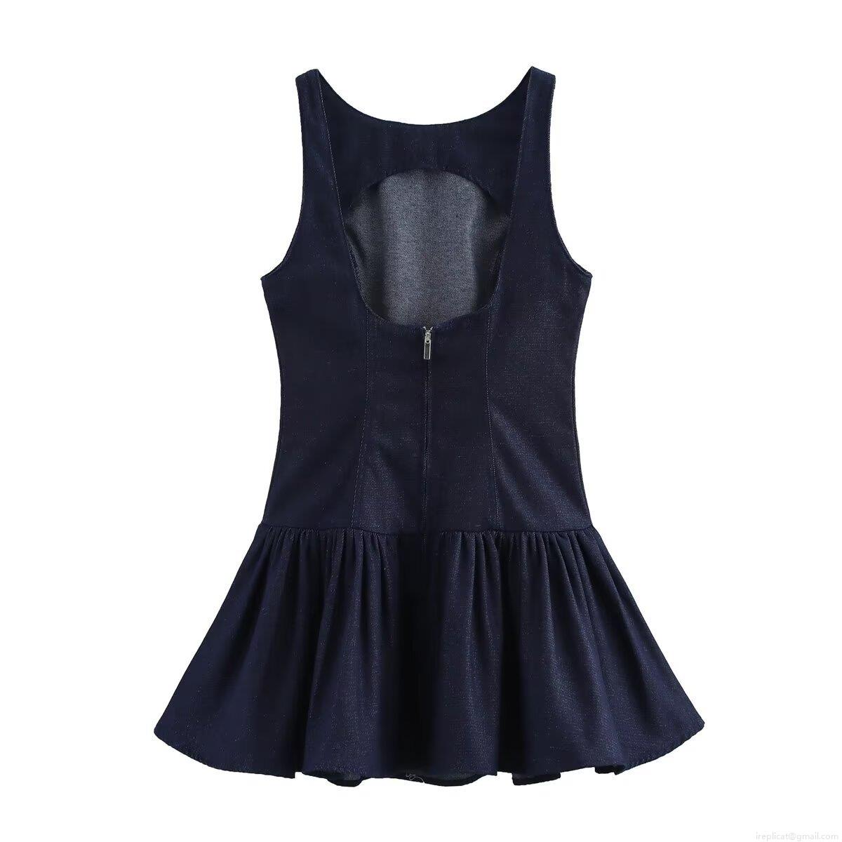 • Women's Summer Sleeveless Round Neck Hollow Out Back Zipper Mini Polyester Denim Style Dress With Pleated Ruffle Hem Casual Streetwear Fashion