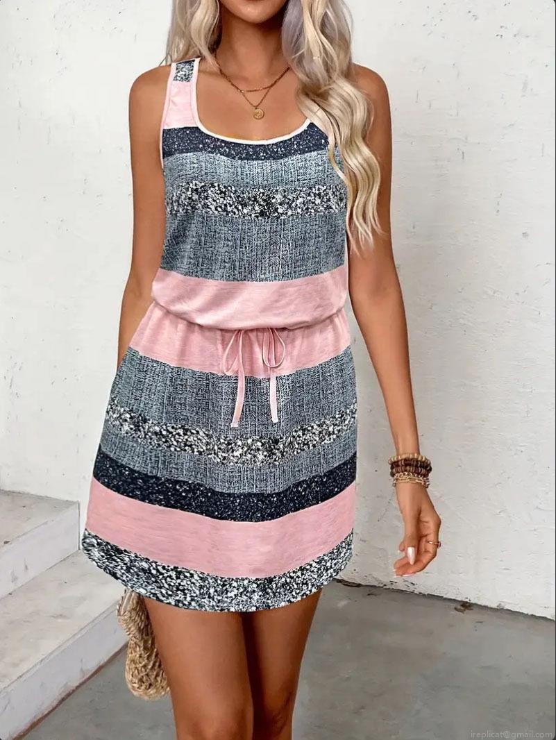 Women's Summer Striped Sleeveless Mini Dress Polyester Spandex Blend Drawstring Waist Casual Beach Vacation Sundress Bodycon Dress