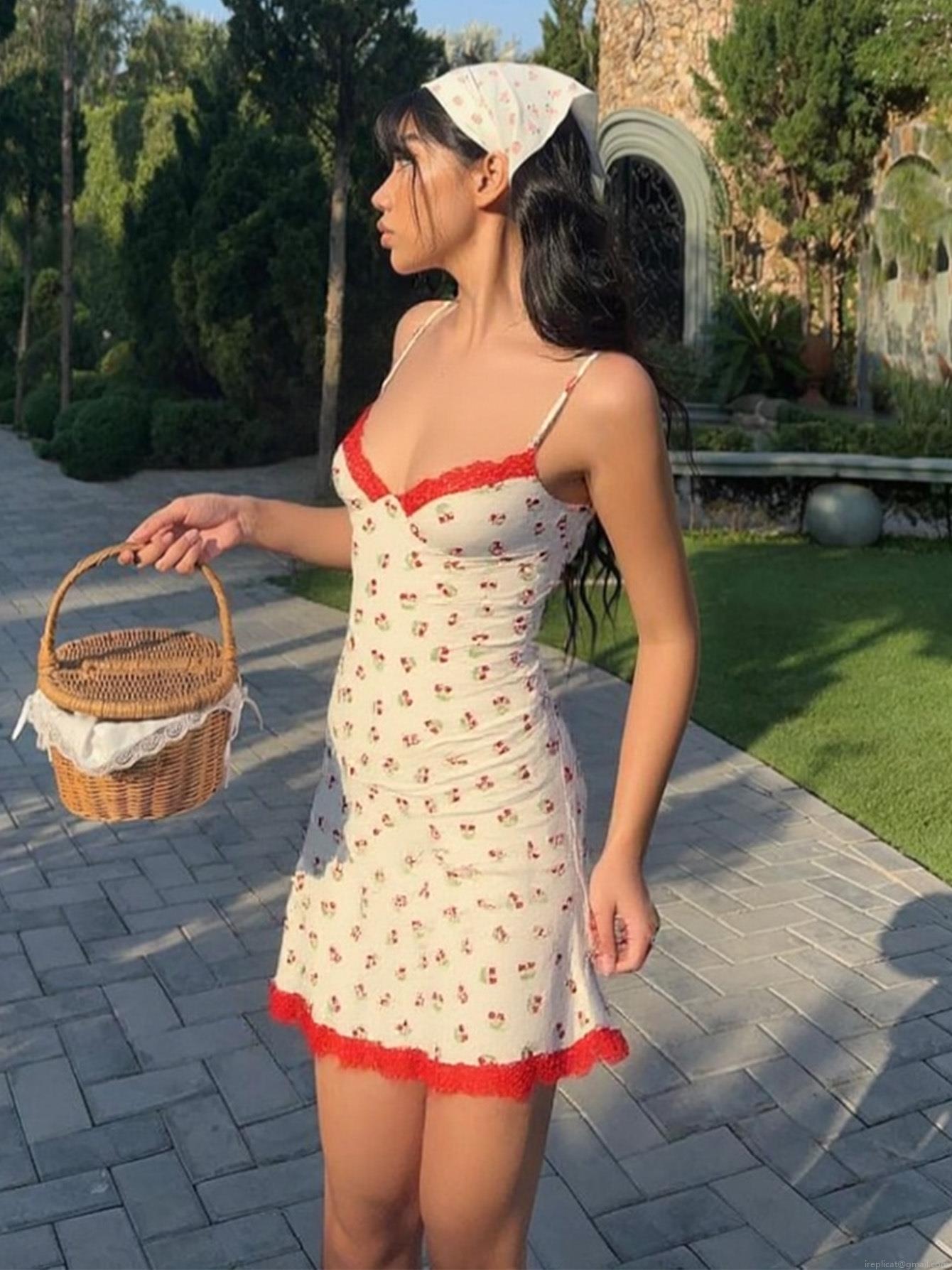 • Women's Summer Sweet Cherry Print Mini Cami Dress Lace Trim V Neck Sleeveless Backless Polyester Spandex Slip Dress For Vacation Casual Party