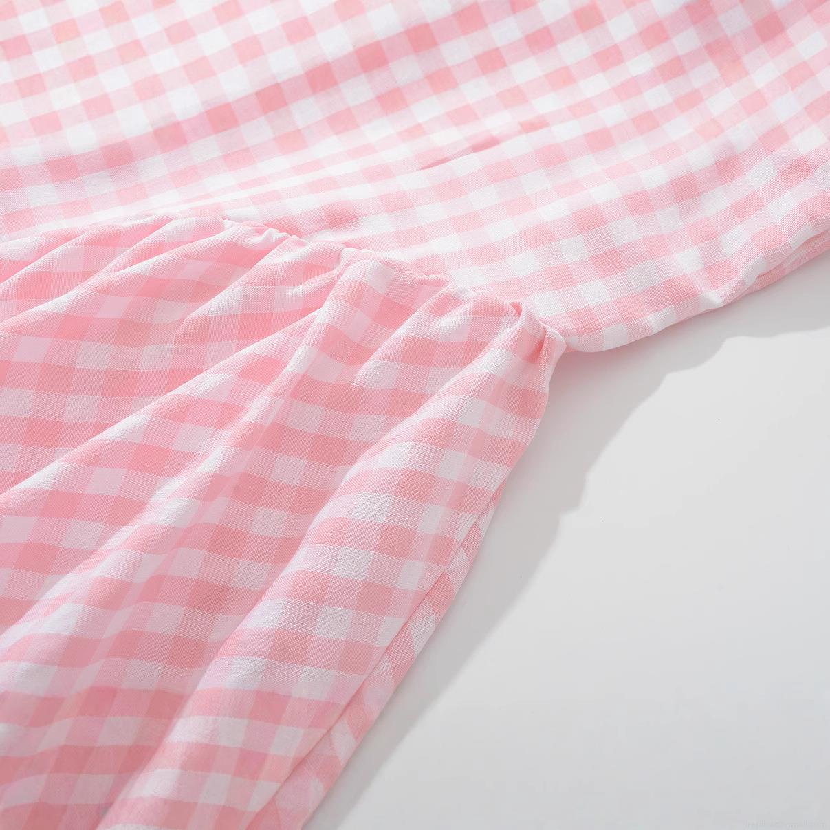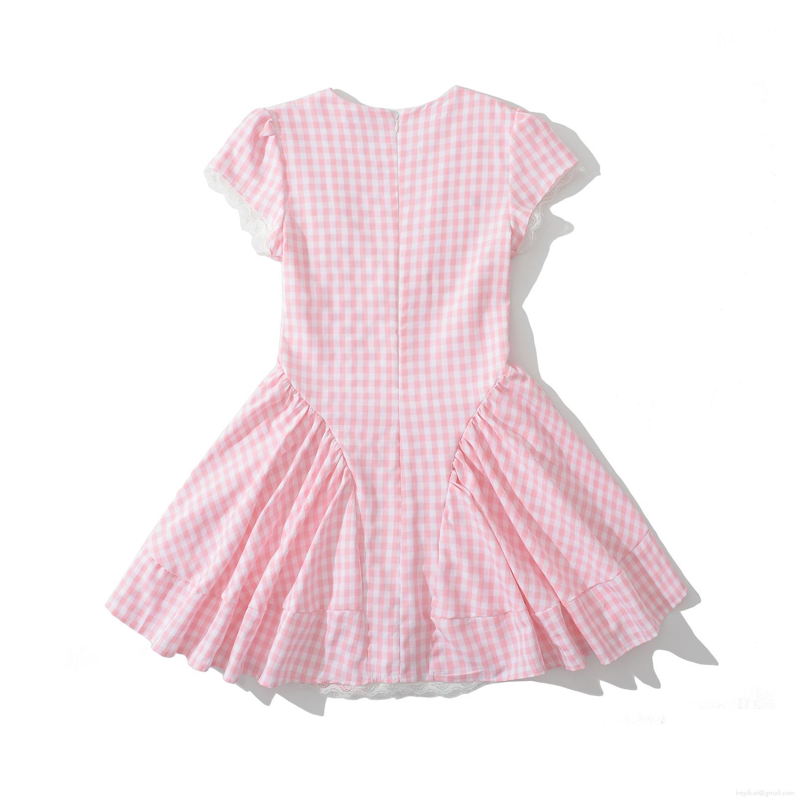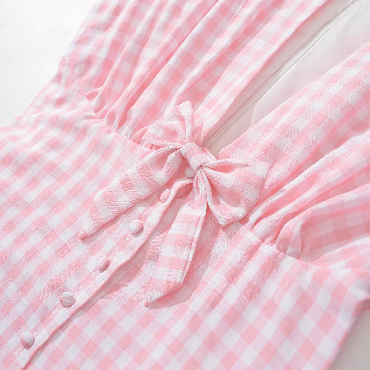 • Women's Summer Sweet Gingham Mini Dress With Lace Trim V-Neck Bow Patchwork Short Sleeve Polyester Cotton Back Zipper A-Line Dress For Vacation Party