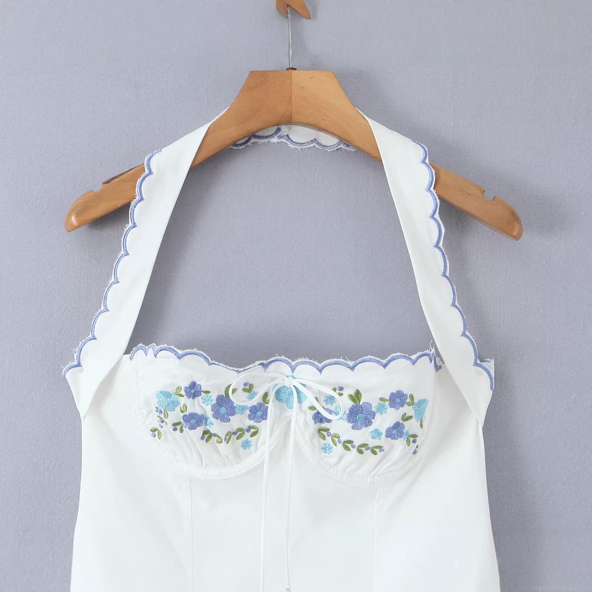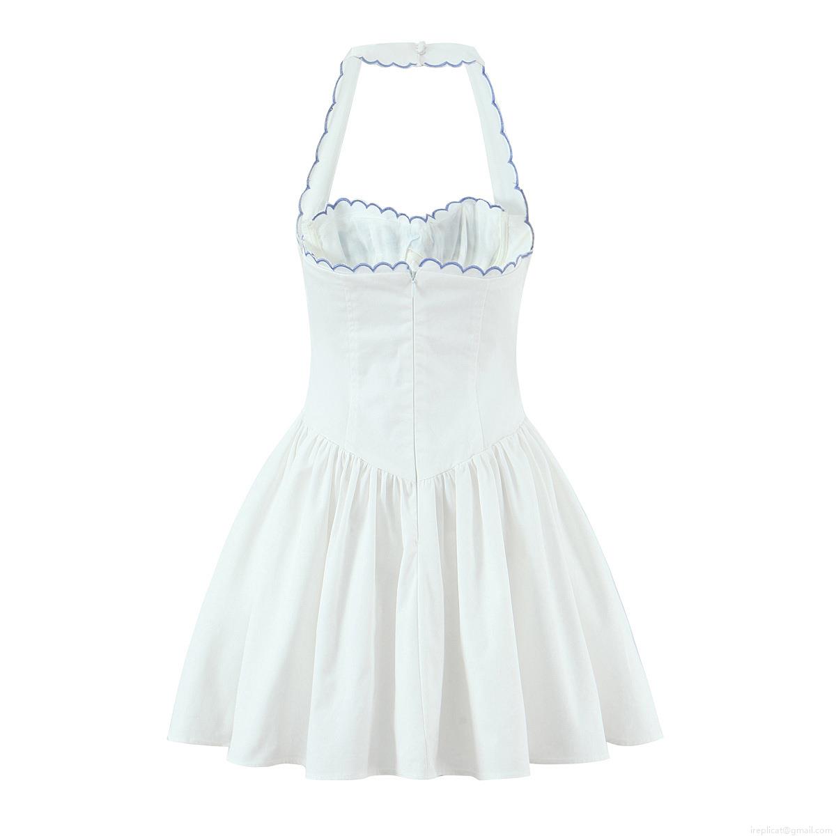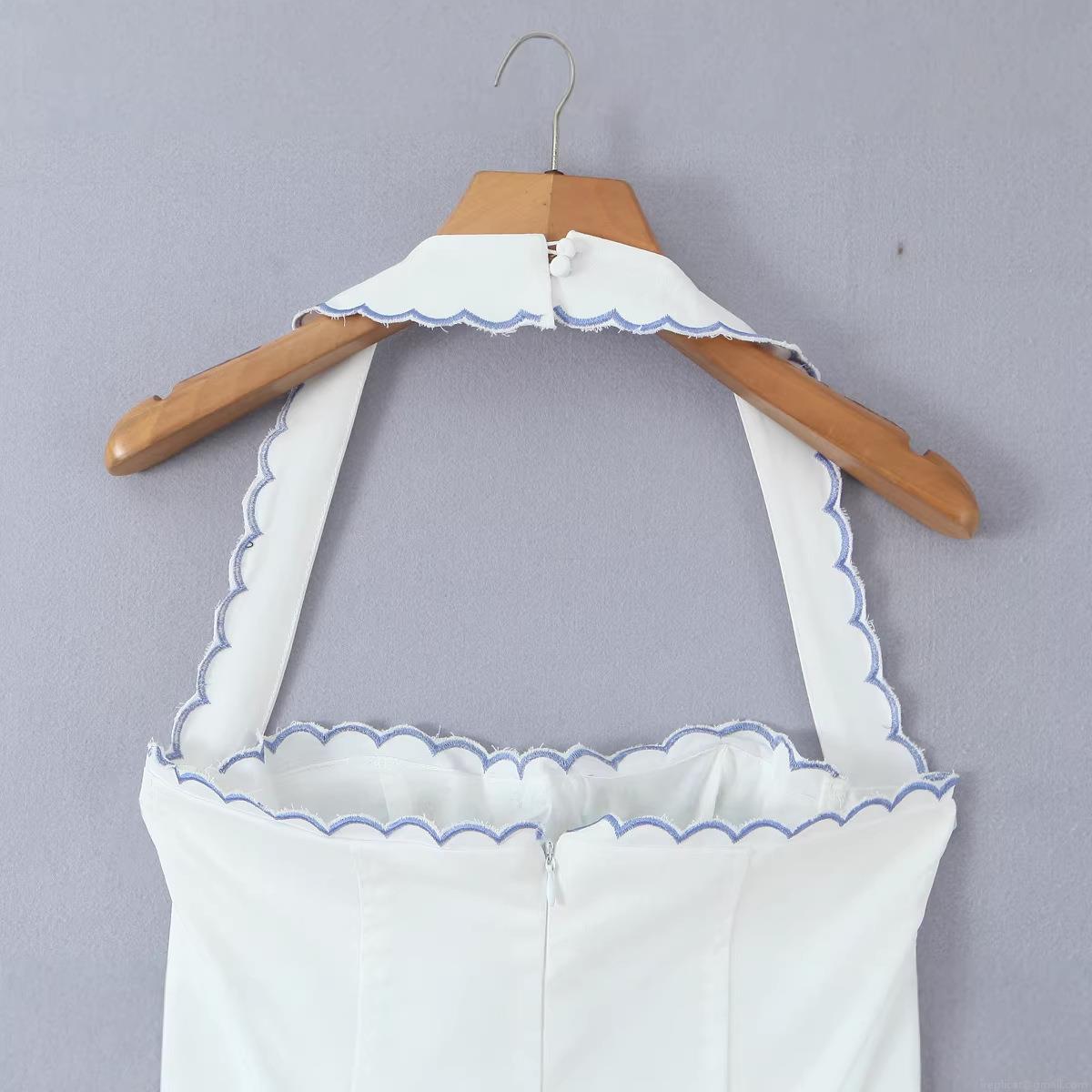 • Women's Summer White Halter Neck Mini Dress Floral Embroidered Scalloped Edge Slim Fit Sleeveless Cotton A-Line Dress for Casual Party Vacation