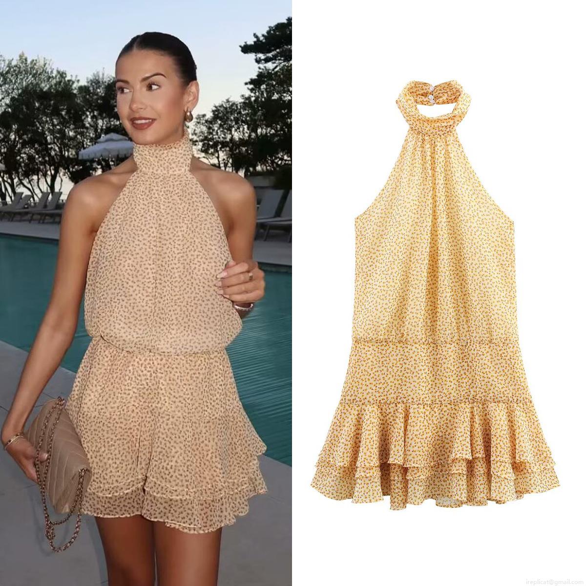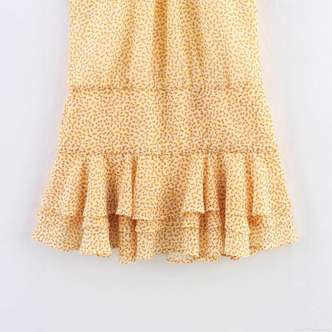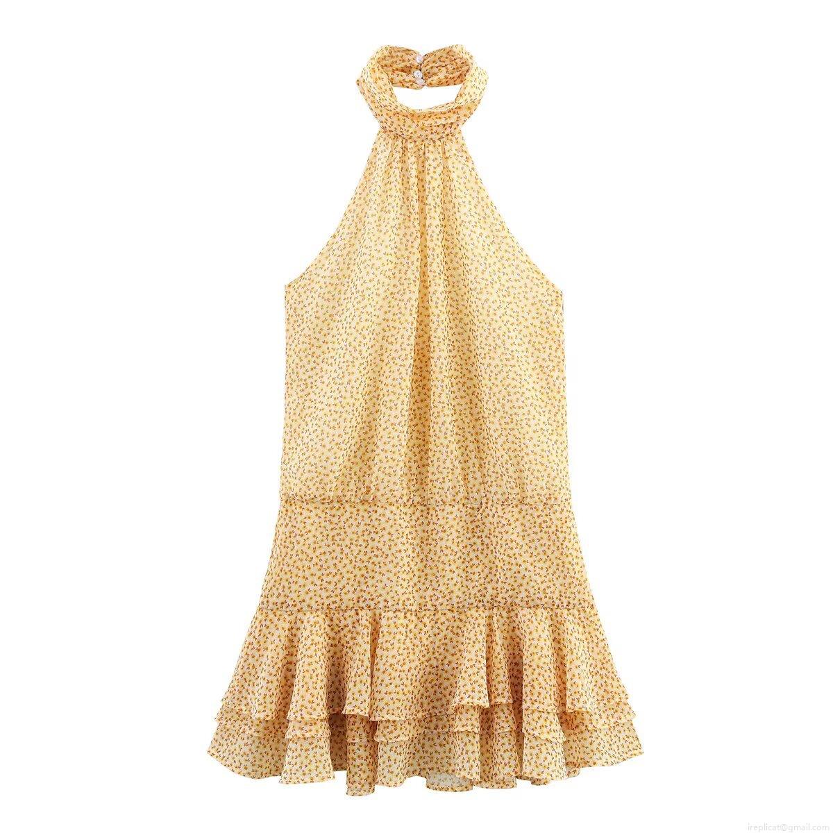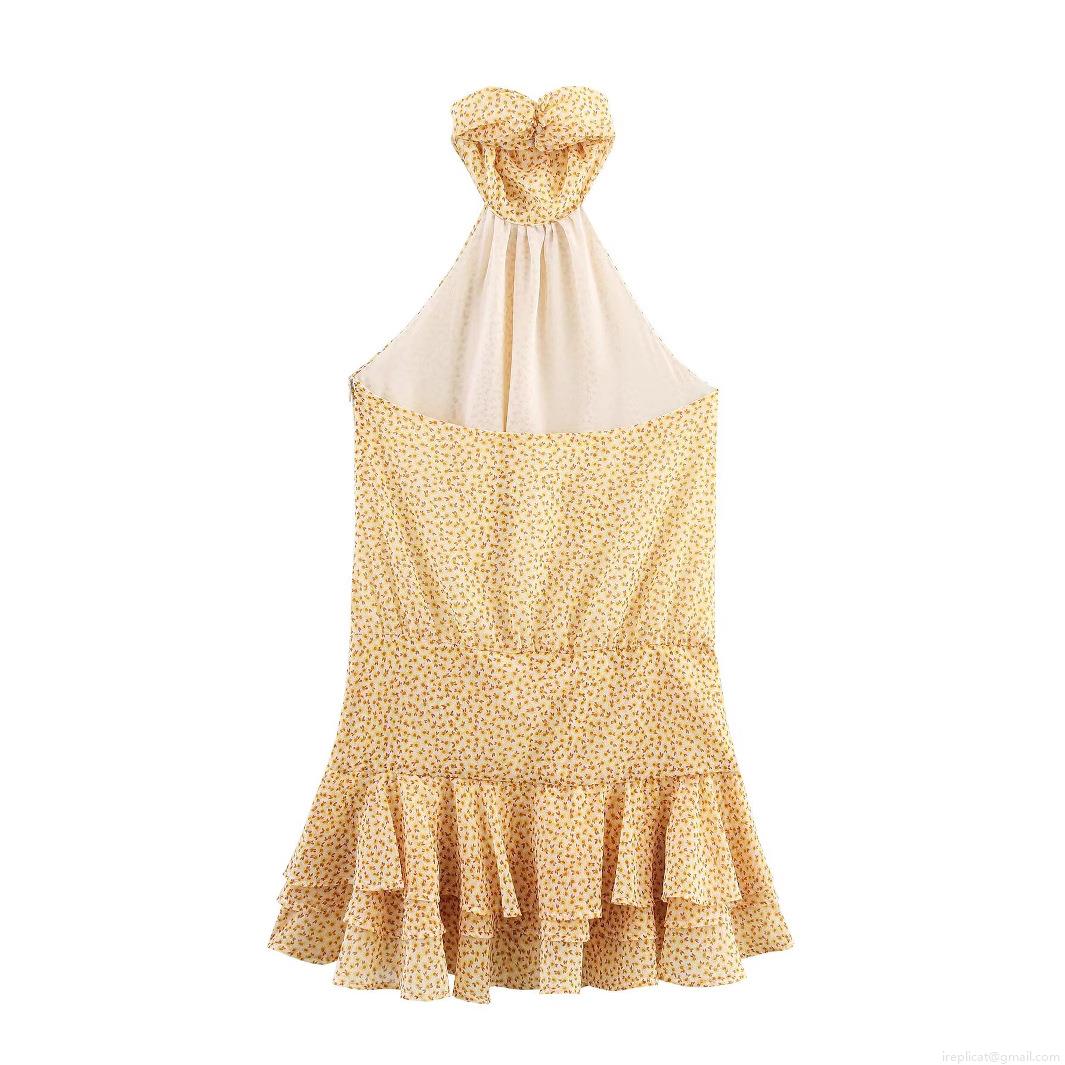 Sunflower, Floral Pattern, Ruffles, Printing, Neckband, Backless, Multi-layer Design