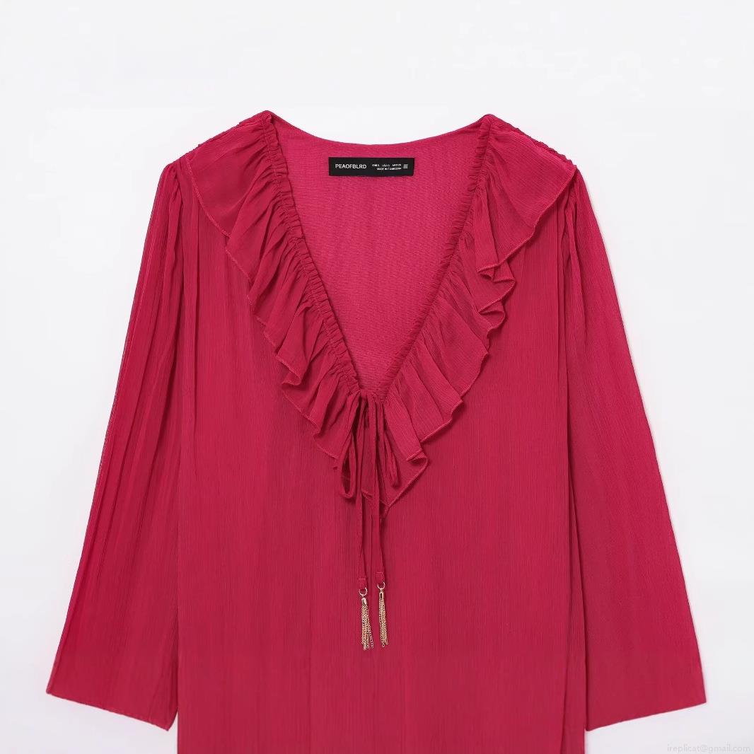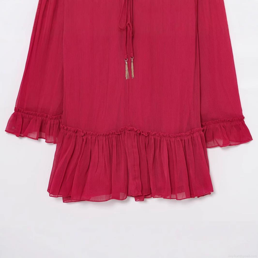 • Women's V Neck Long Sleeve Mini Dress Ruffle Tassel Drawstring Solid Color Wrinkle Chiffon Elegant Party Dress