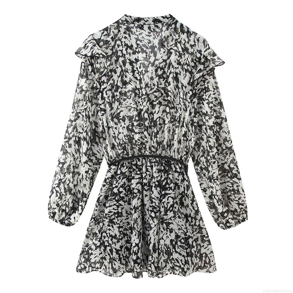 • Women's V Neck Ruffle Long Sleeve Mini Dress With Belt Polyester Black White Abstract Print Chiffon Feel Flowy Short A-Line Dress For Spring Casual Daily Party Streetwear Fashion