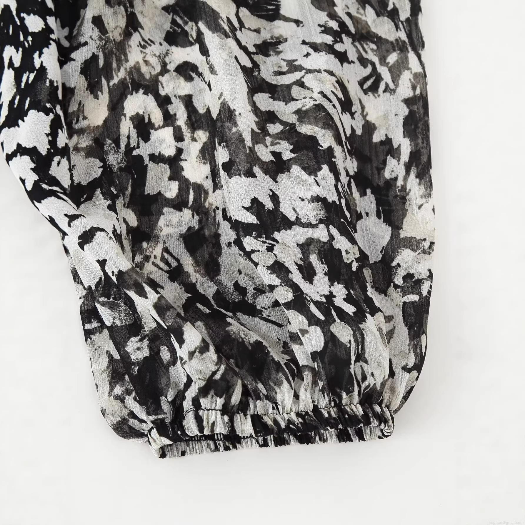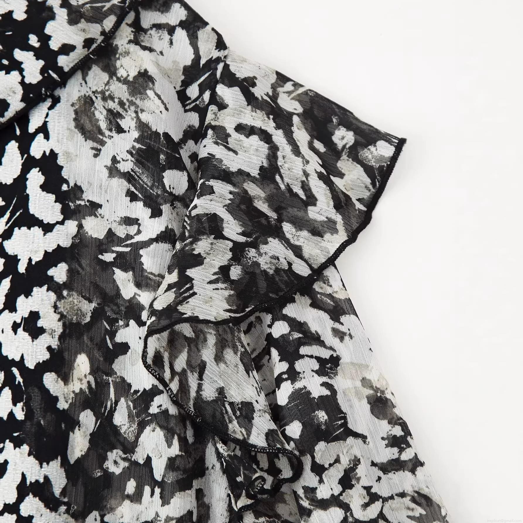 Ruffles, Printing, Black And White Floral Print, Layered Decoration, With Belt, Abstract Ink Wash Print