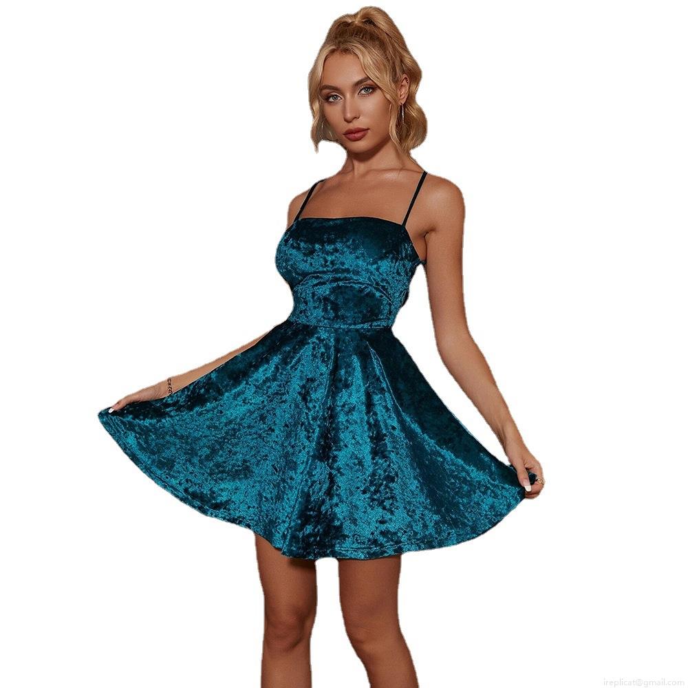 • Women's Velvet Mini Slip Dress Elegant Spaghetti Strap Backless Criss Cross A-Line Short Dress Sexy Evening Party Cocktail Dress High Waist Lady Clubwear