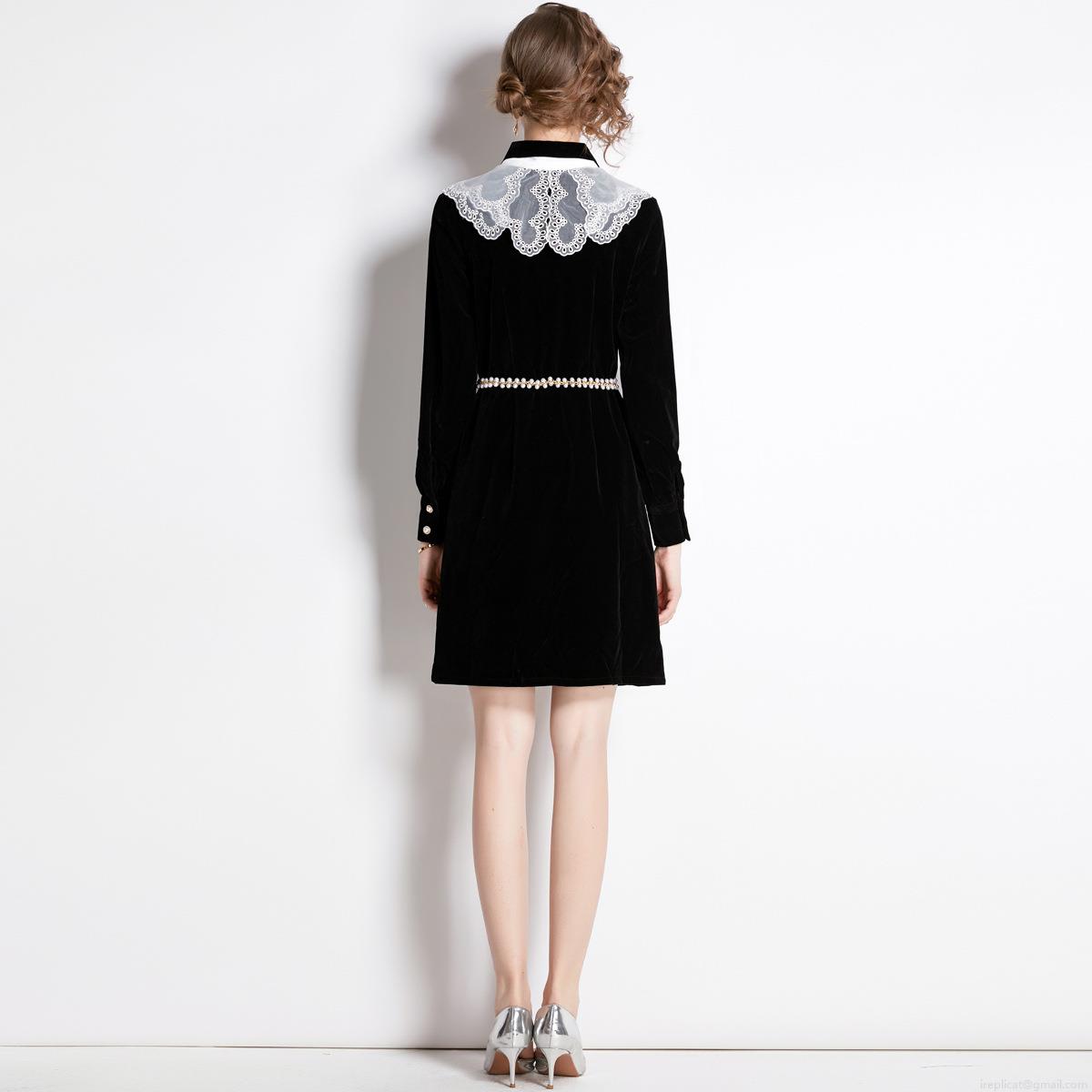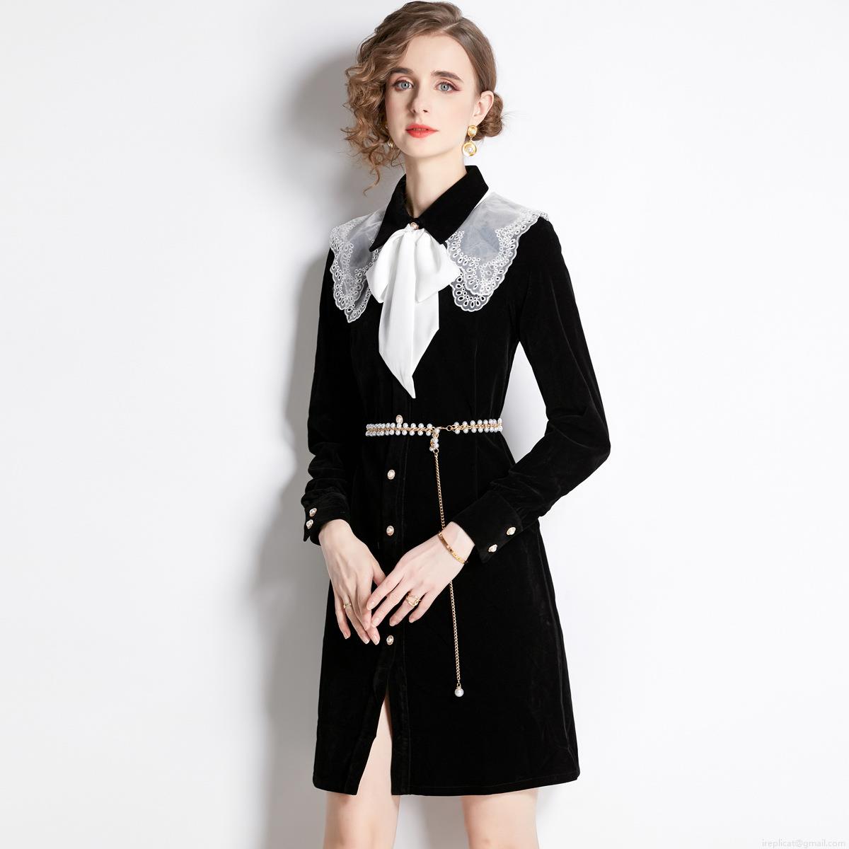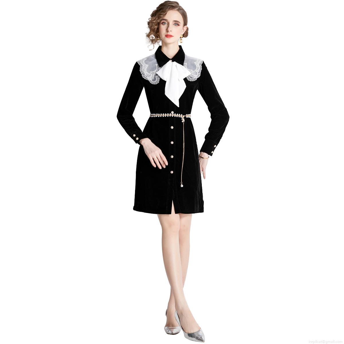 • Women's Vintage Black Velvet Mini Dress Elegant Long Sleeve A-Line Party Dress With White Lace Collar Bow Tie And Pearl Waist Chain Slim Fit Retro Short Dress