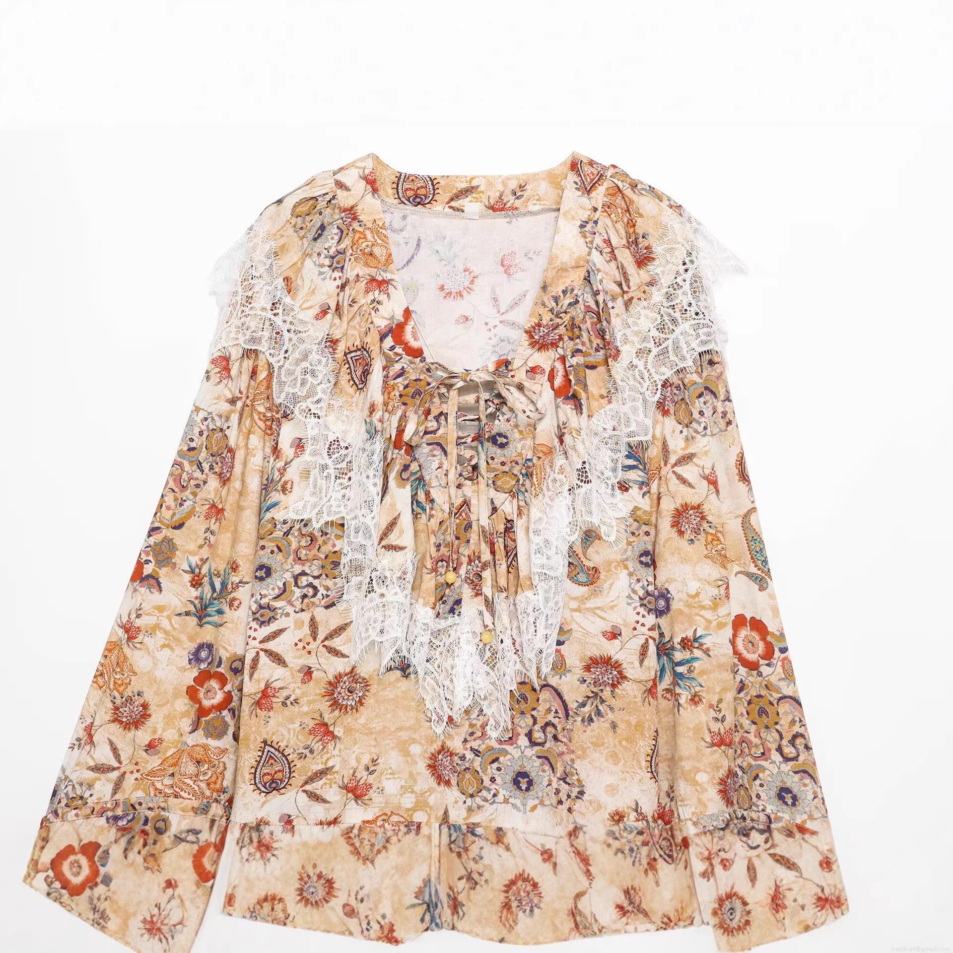 Women's Vintage Bohemian Paisley Floral Print Mini Dress With White Lace Trim V-Neck Tie Front Long Sleeve Summer Casual Vacation Beach Dress