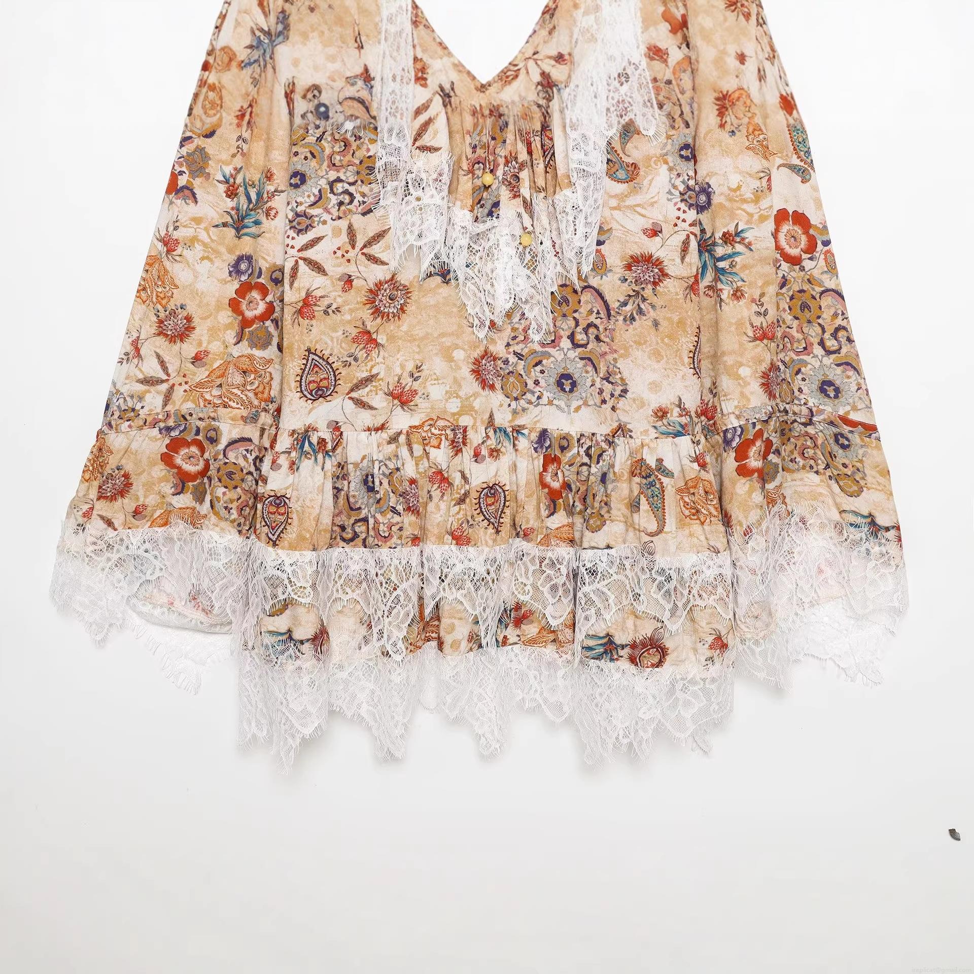 • Women's Vintage Bohemian Paisley Floral Print Mini Dress With White Lace Trim V-Neck Tie Front Long Sleeve Summer Casual Vacation Beach Dress