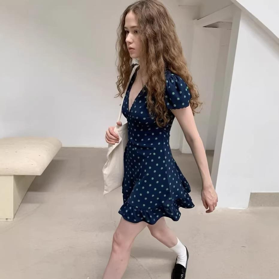 • Women's Vintage Floral Mini Dress V-Neck Scalloped Edge Short Sleeve Smocked High Waist Ruffle Hem Polyester Dress For Summer Vacation Daily Sweet Style