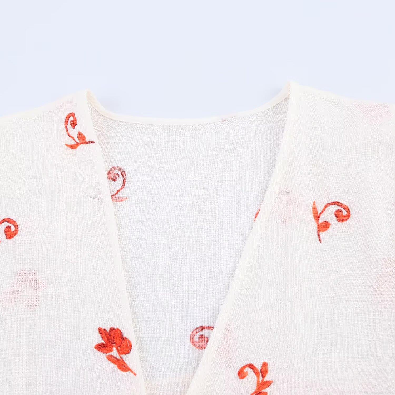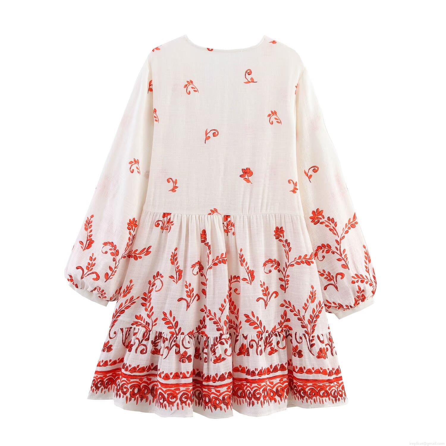 • Women's Vintage Floral Print Mini Dress Linen V Neck Long Sleeve Ruffle Hem Bohemian Vacation Beach Dress With Tassels