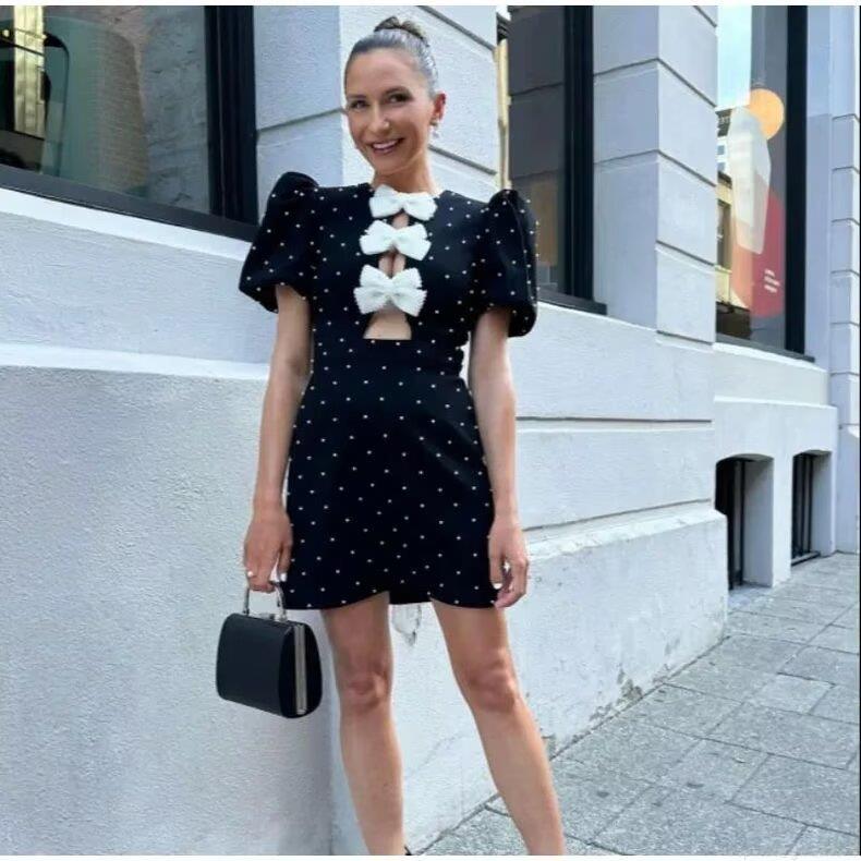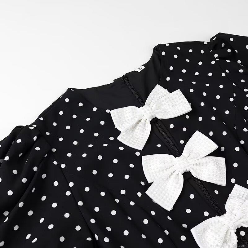Polka Dots, Bow, Hollow Out, Zipper, Puff Sleeves