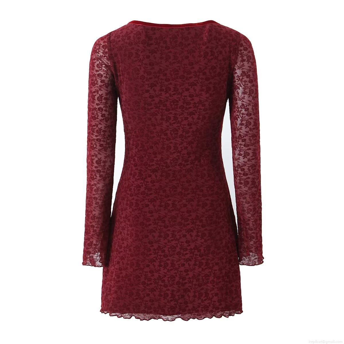 Women's Vintage Square Neck Lace Bodycon Mini Dress Sexy Floral Flocking Long Sleeve Velvet Bow Burgundy Party Clubwear Evening Dress