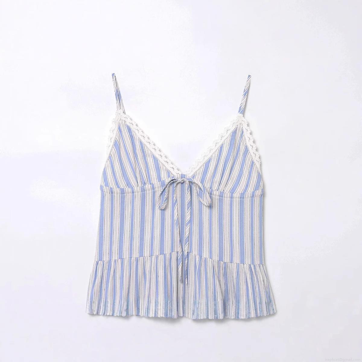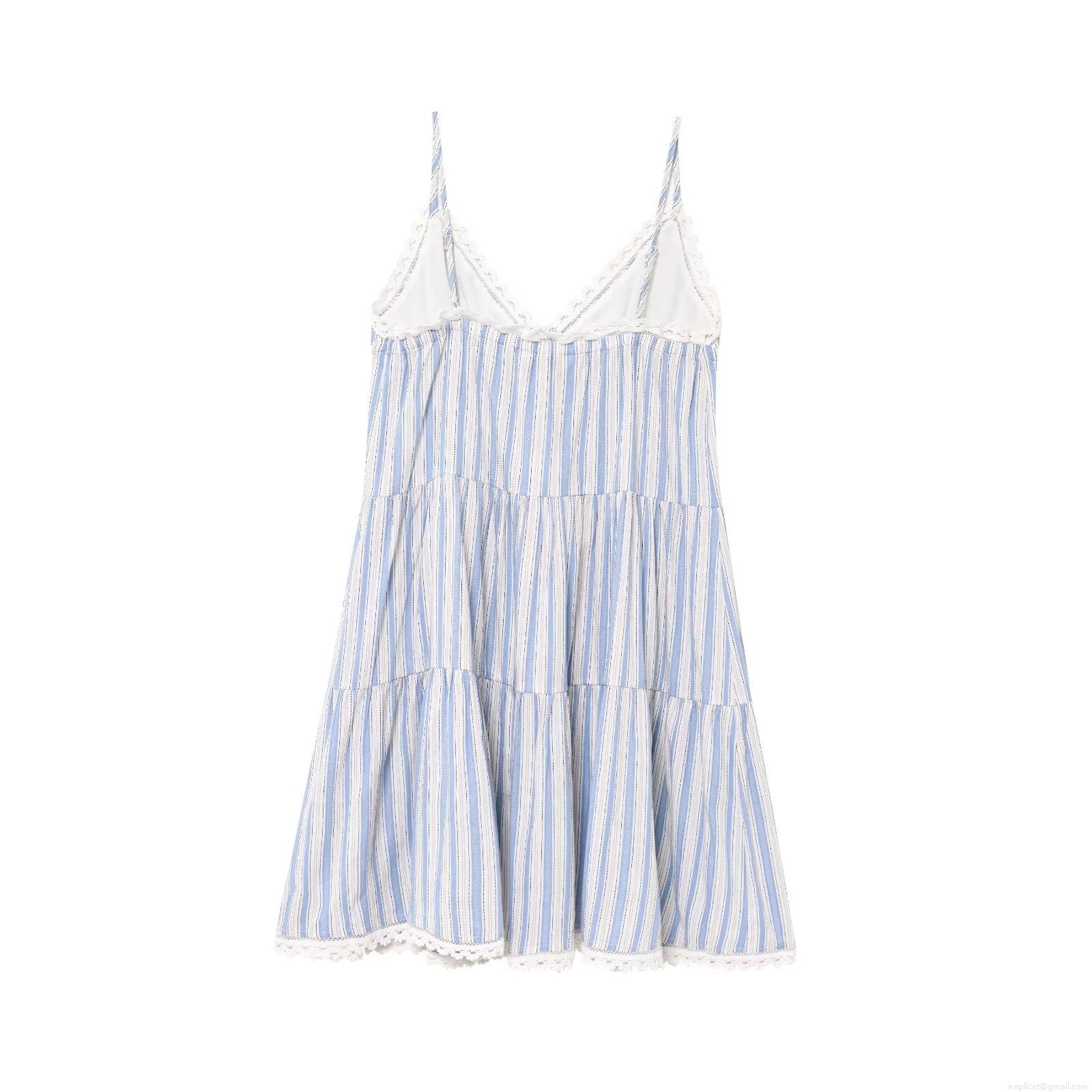 Women's V-Neck Camisole Dress Blue White Vertical Striped Lace Trim Tiered Mini Dress Summer Sleeveless Backless A-Line Party Sundress For Women