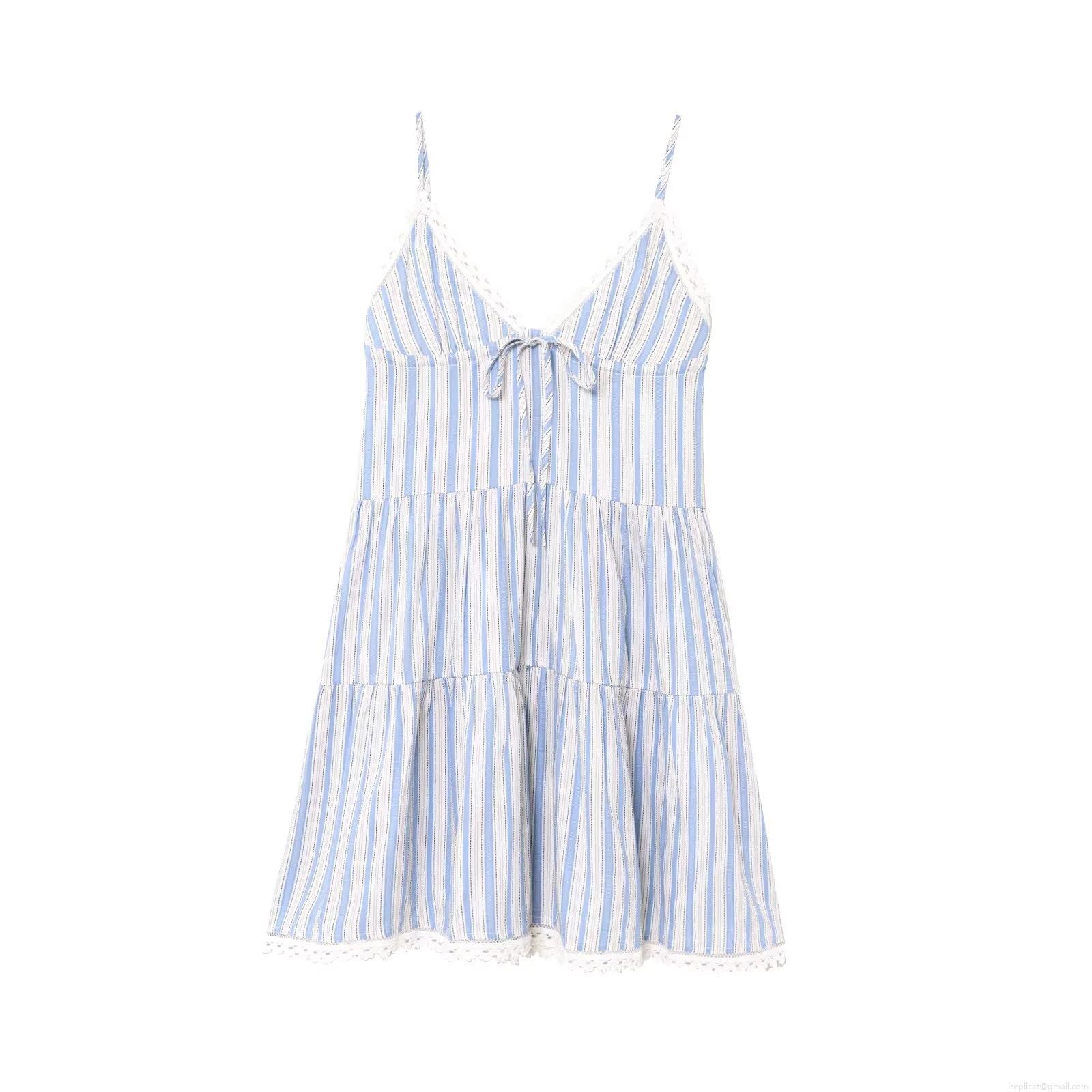 • Women's V-Neck Camisole Dress Blue White Vertical Striped Lace Trim Tiered Mini Dress Summer Sleeveless Backless A-Line Party Sundress For Women