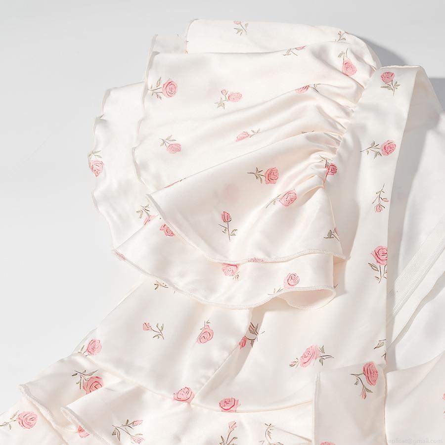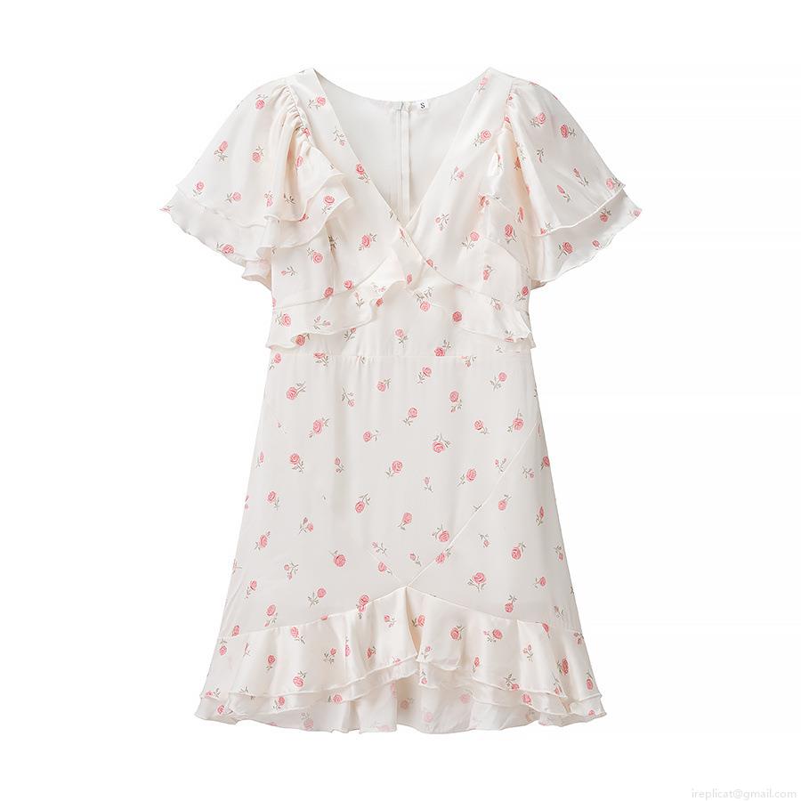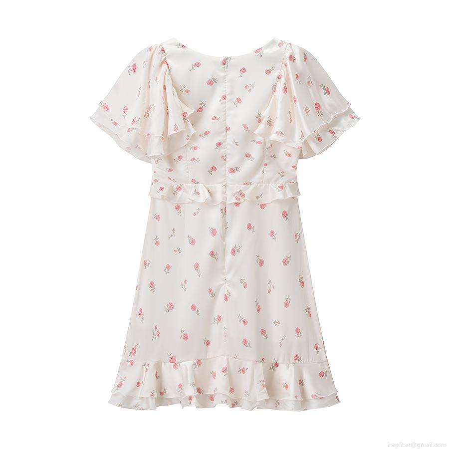 Floral Pattern, Ruffles, Waist shaping, Rose, Printing, V-neck, Flying Sleeves