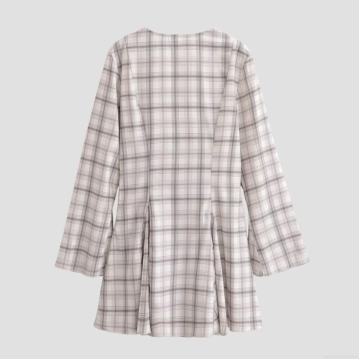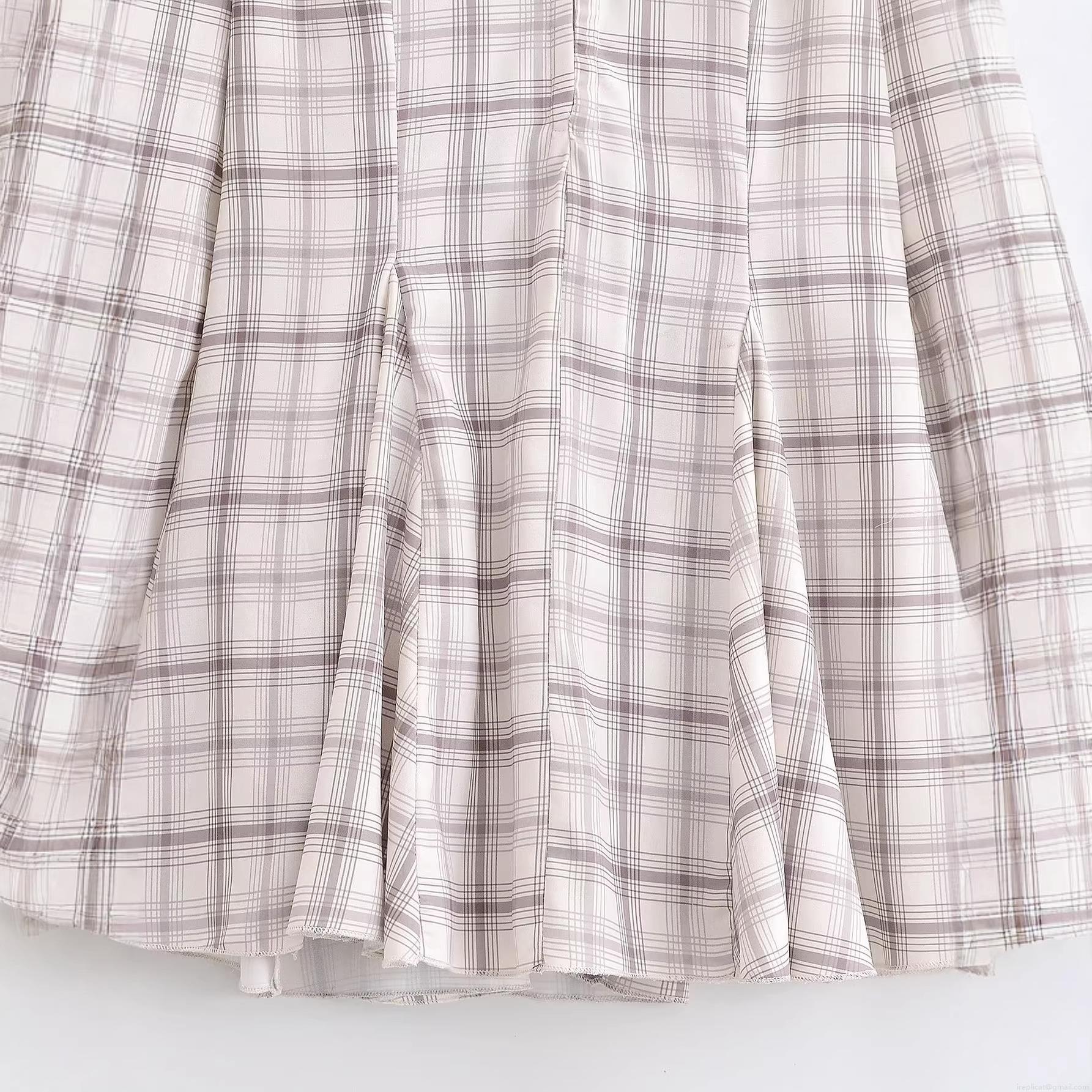 Checkered Pattern, Pleats, V-neck, A-line Skirt