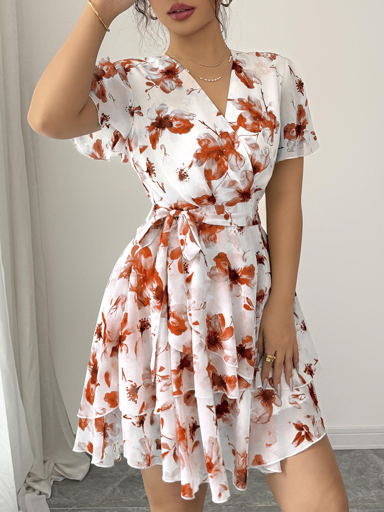 • Women's V-Neck Short Flare Sleeve Floral Print Tiered Ruffle Hem A-Line Dress Summer Vacation Casual Waist Tie Cake Dress