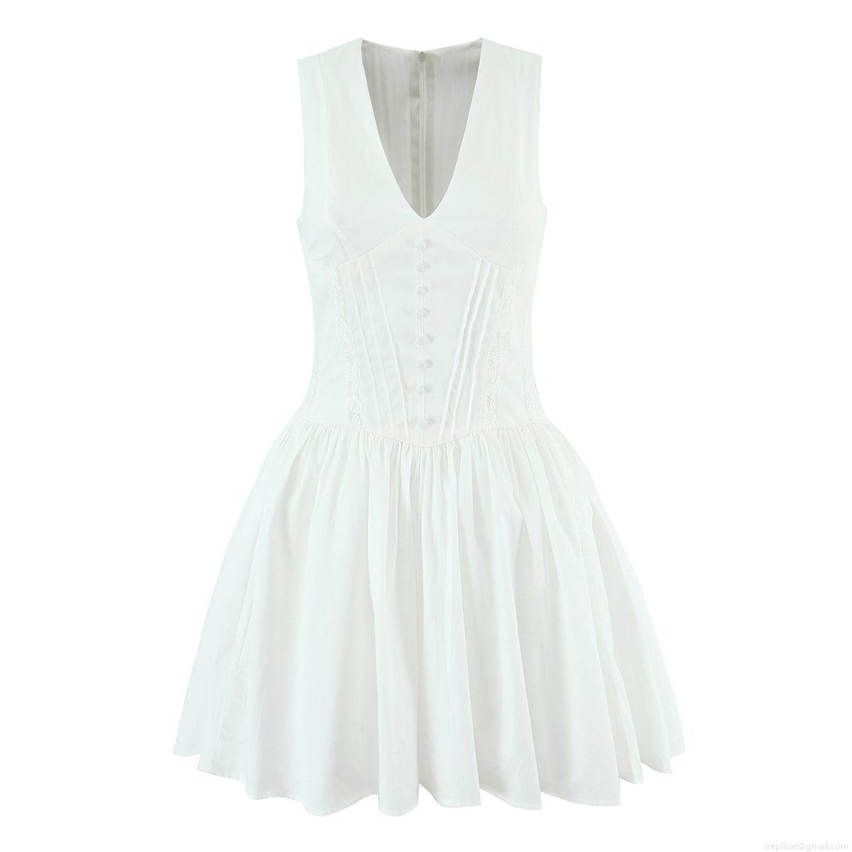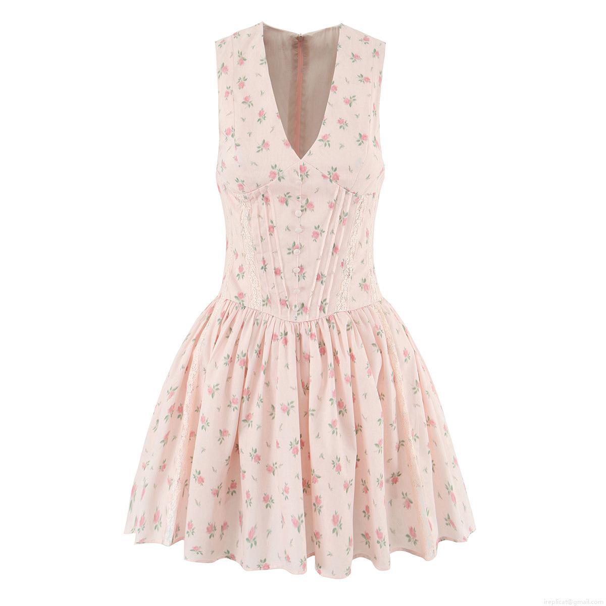 Solid Color, Waist shaping, Rose, Pleats, V-neck, Lace Patchwork, Fabric Button
