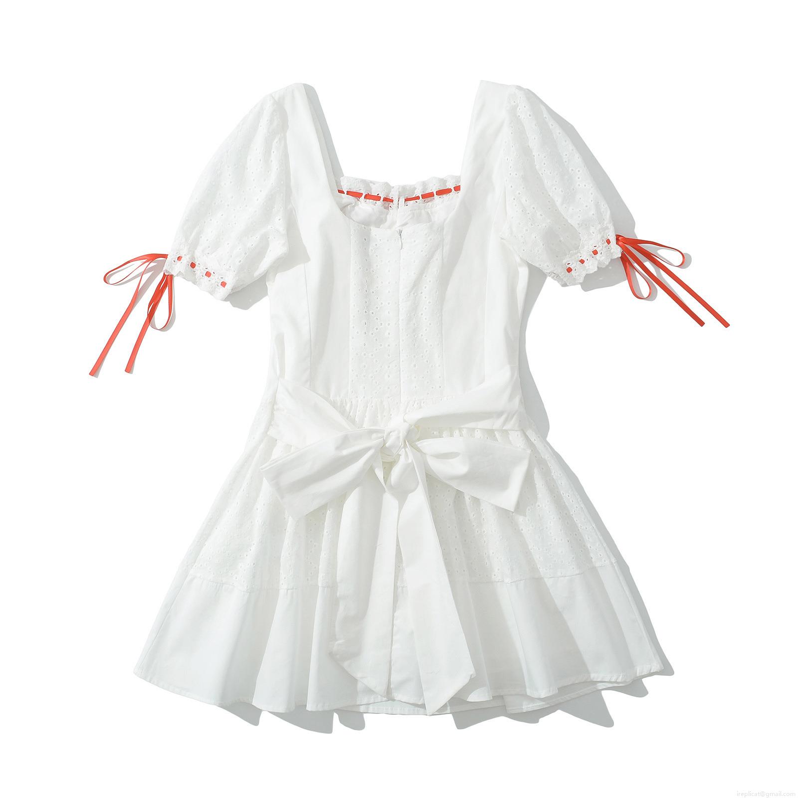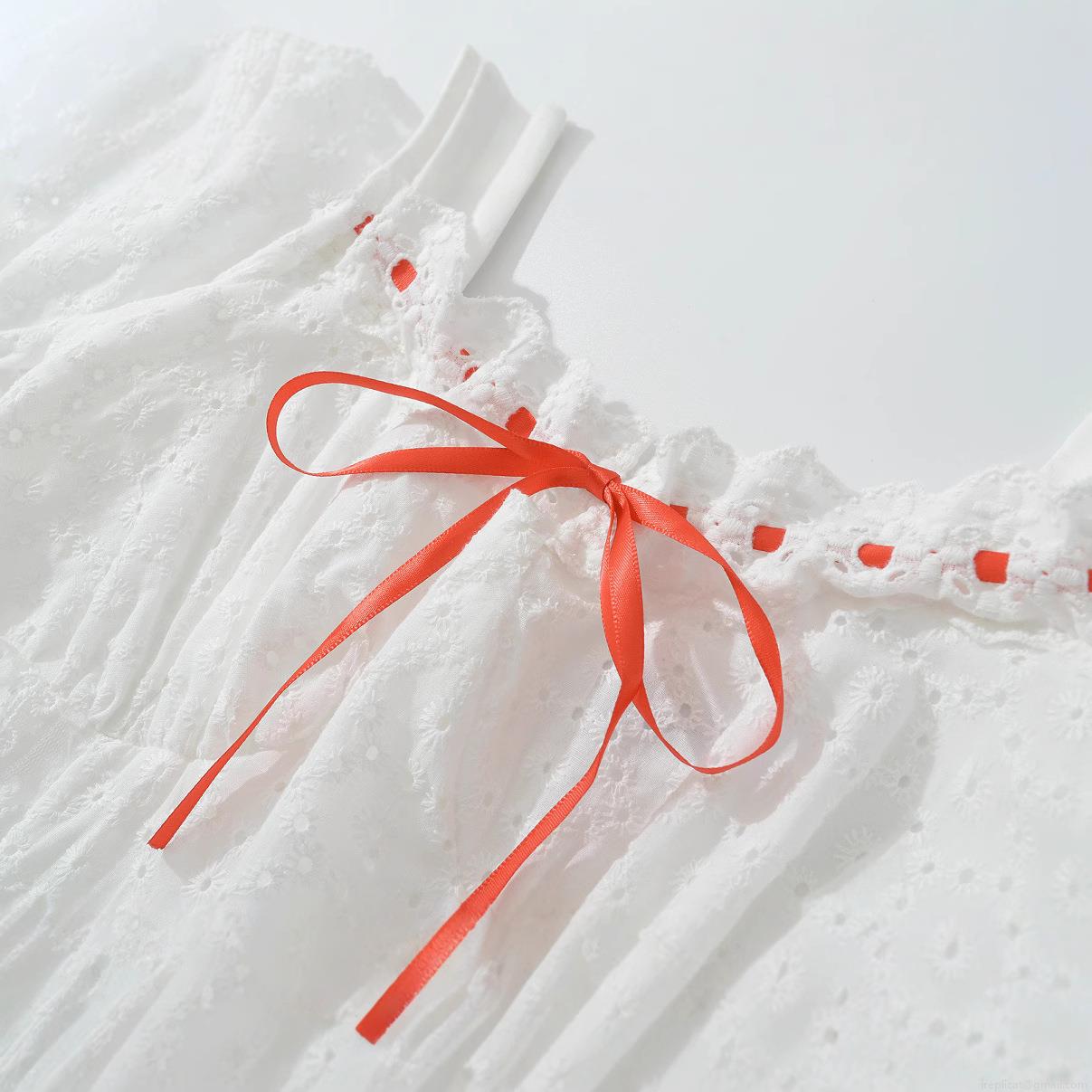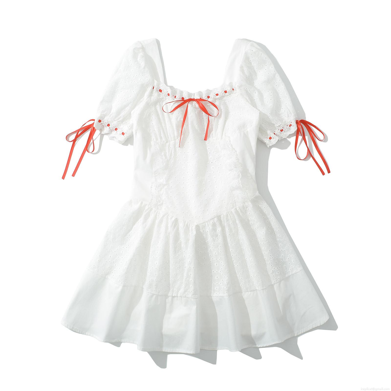 Women's White Eyelet Embroidery Lace Mini Dress Square Neck Puff Sleeve Red Ribbon Bow Sweet French A-Line Cotton Summer Dress