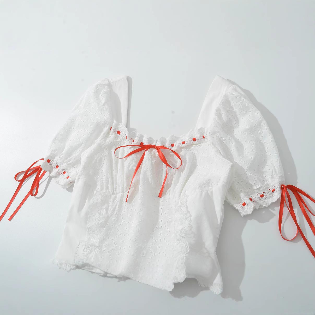 Solid Color, Lace, Bow, Embroidery, Hollow Out, Puff Sleeves, Floral Embroidery