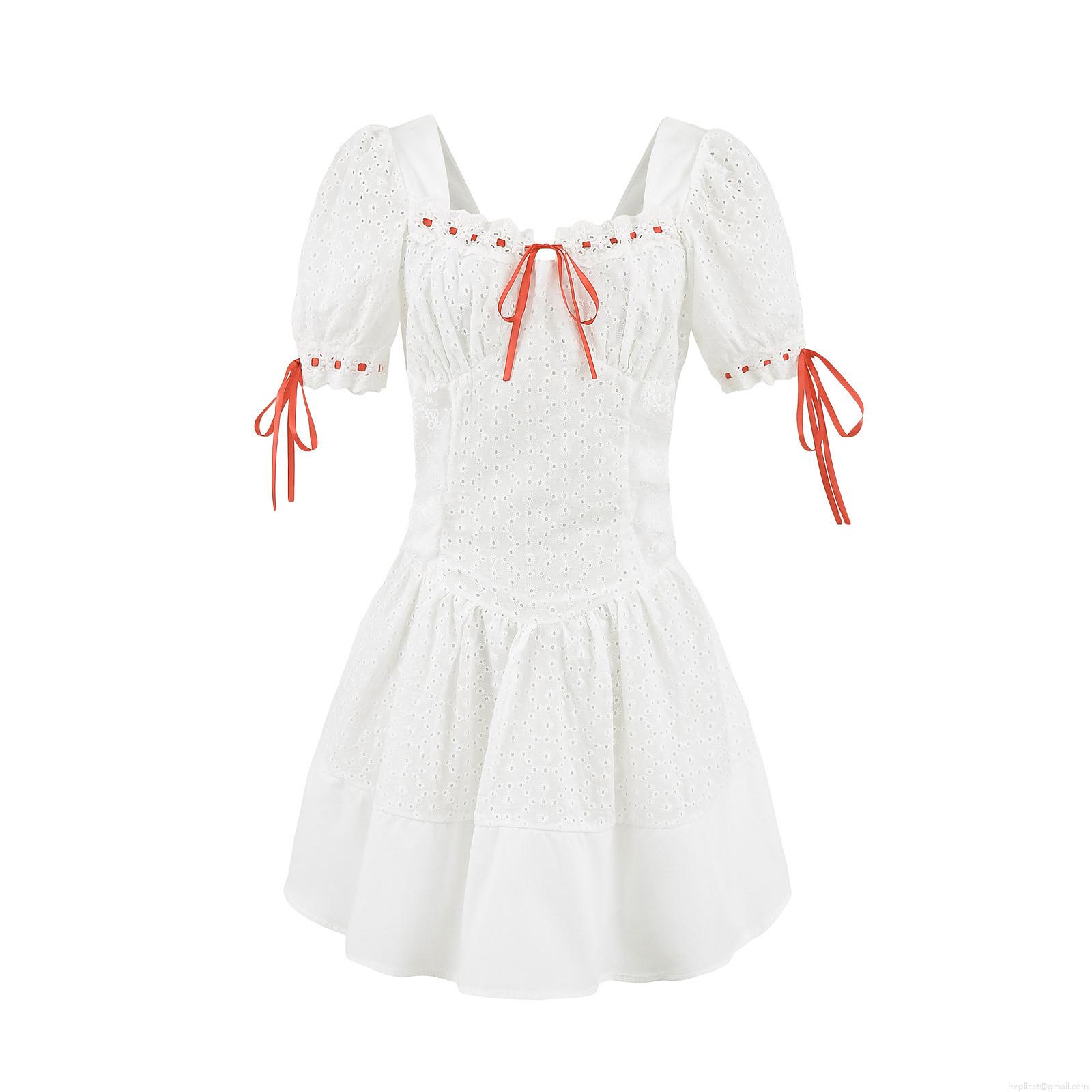 • Women's White Eyelet Embroidery Lace Mini Dress Square Neck Puff Sleeve Red Ribbon Bow Sweet French A-Line Cotton Summer Dress