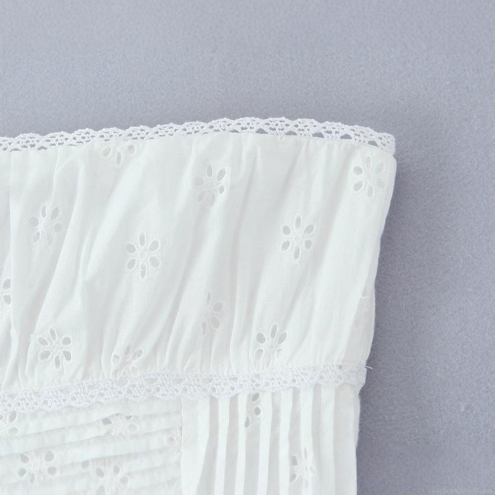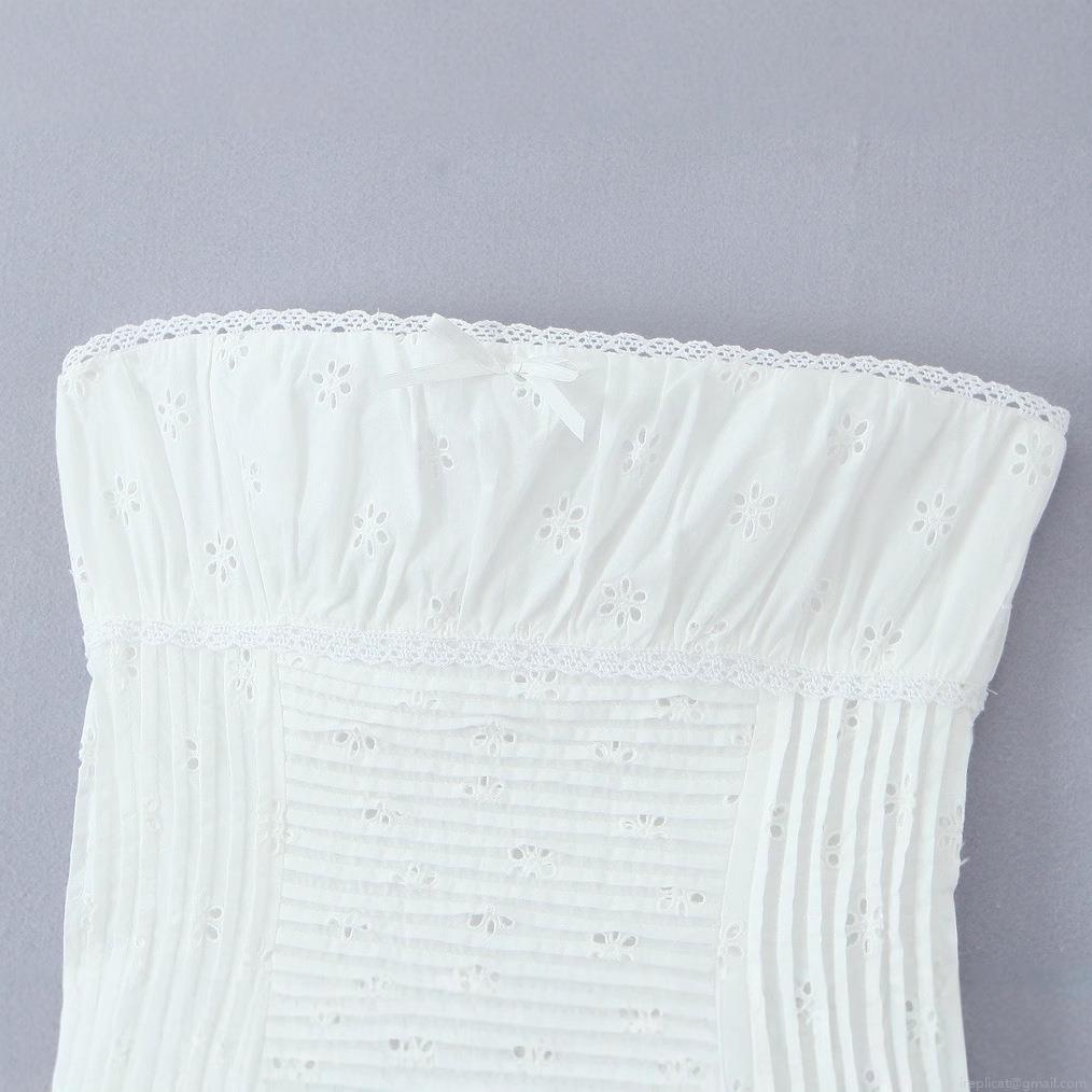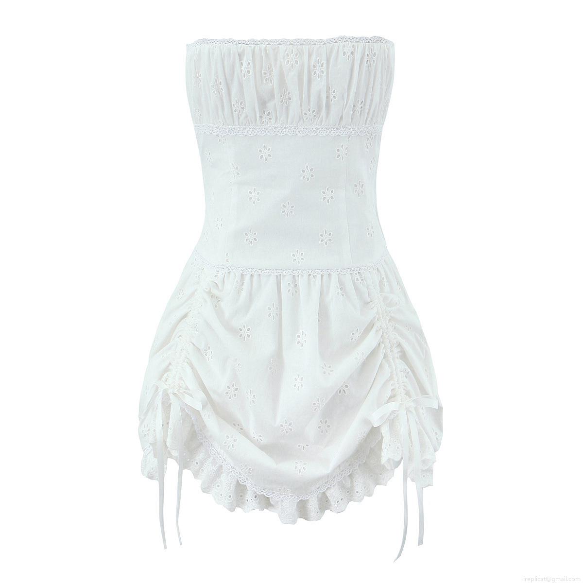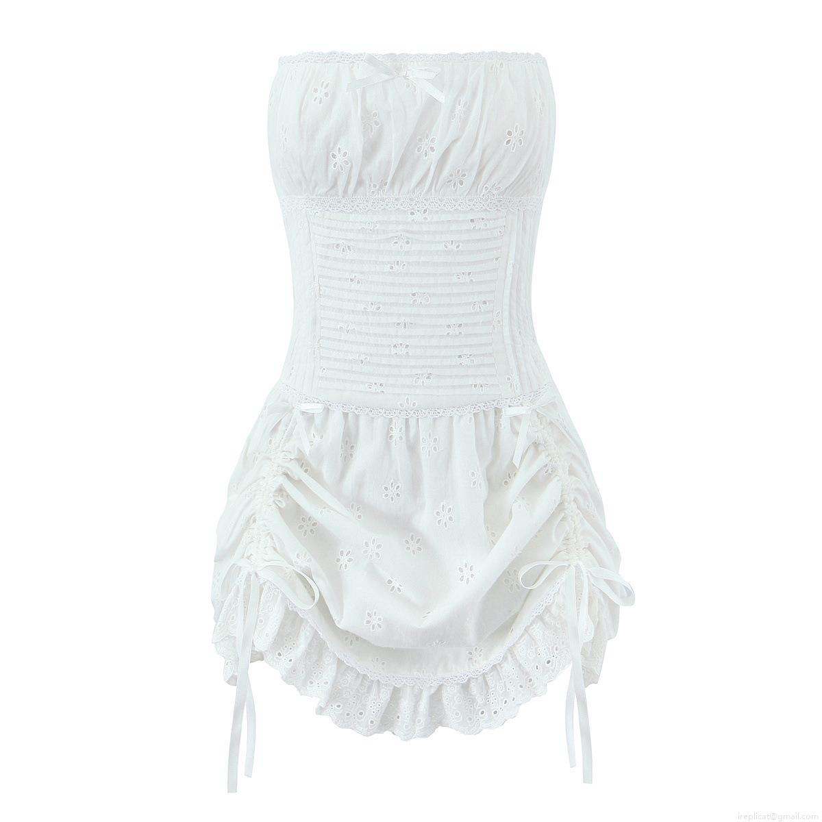 • Women's White Eyelet Embroidery Strapless Mini Dress Elegant Lace Trim Tube Dress with Bow French Vintage Style A-Line Short Skirt