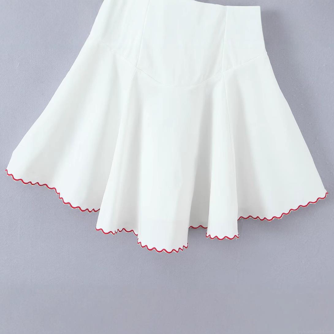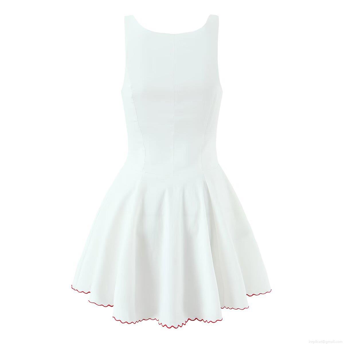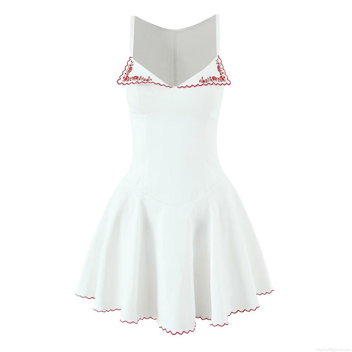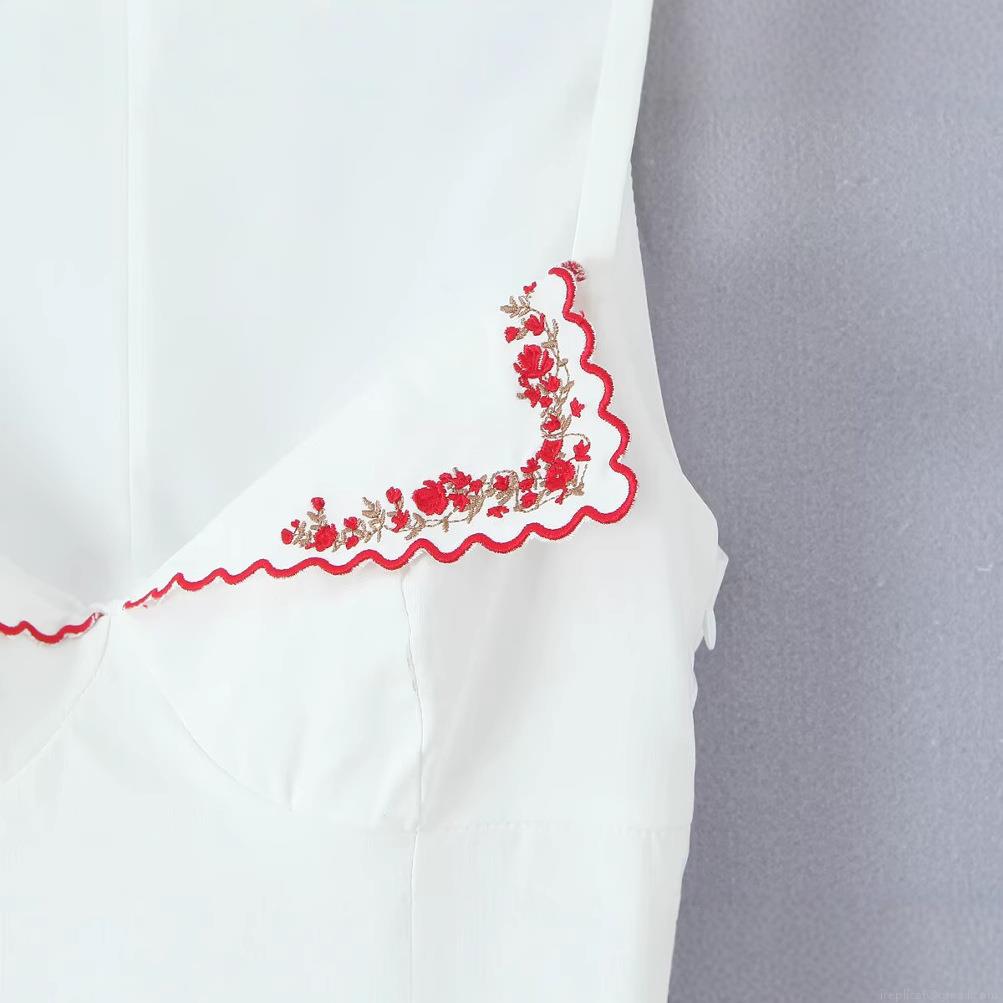 • Women's White Sleeveless Mini A-Line Dress Cotton Blend Red Floral Embroidery Scalloped Edge Lapel Neck Slim Fit Short Sundress For Summer Party Holiday