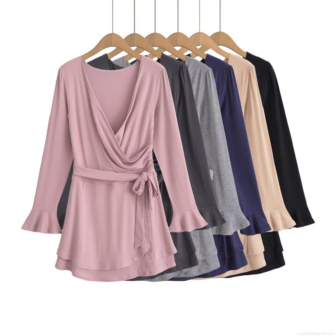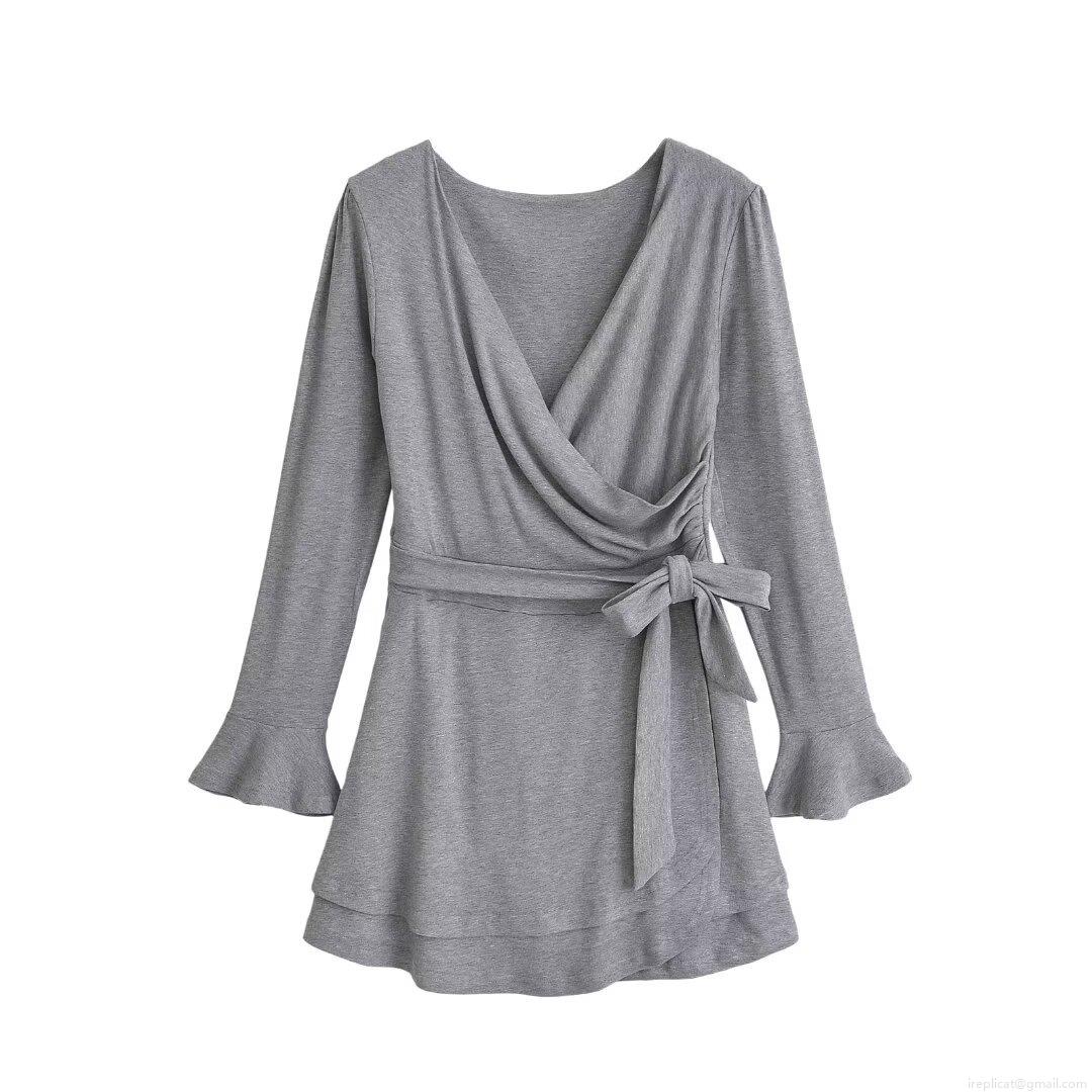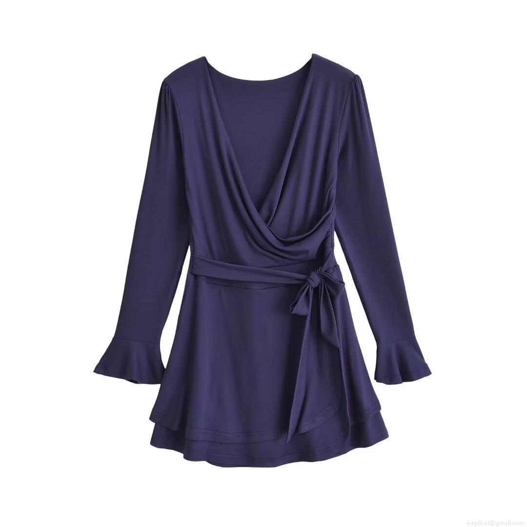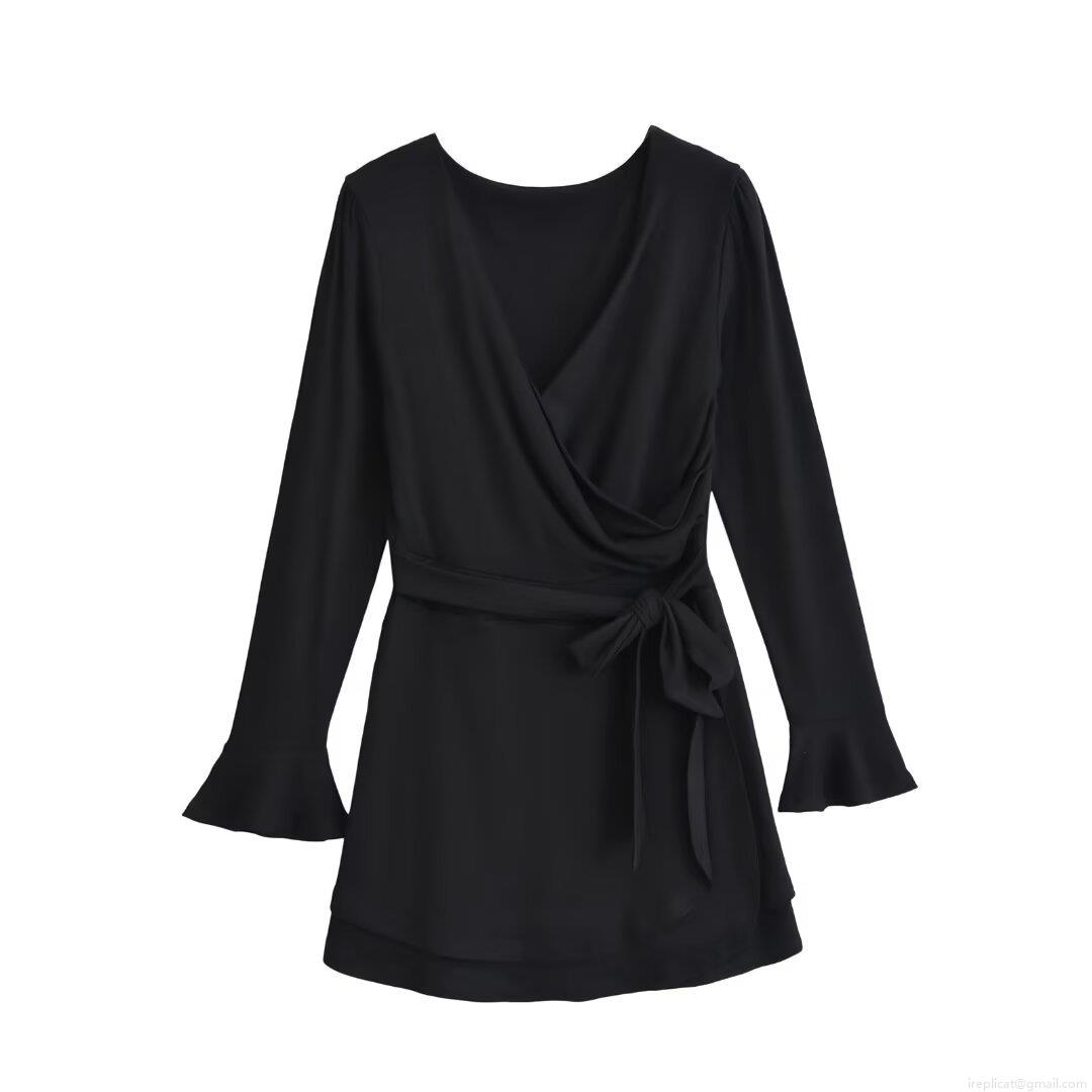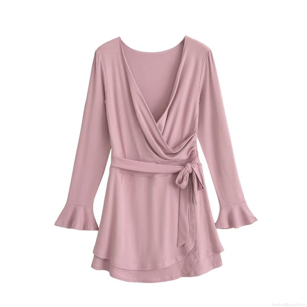 • Women's Winter Fashion V-Neck Long Sleeve Dress Flare Cuff Mini Dress With Tie Waist Wrap Style Sexy Solid Color A-Line Short Dress For Party Dating