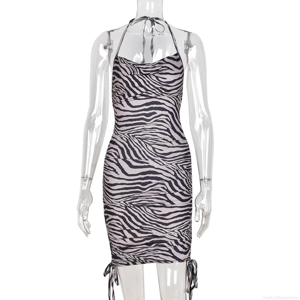Women's Zebra Print Halter Mini Dress Sexy Ruched Drawstring Bodycon Summer Streetwear Y2K Party Clubwear Sleeveless Backless Dress