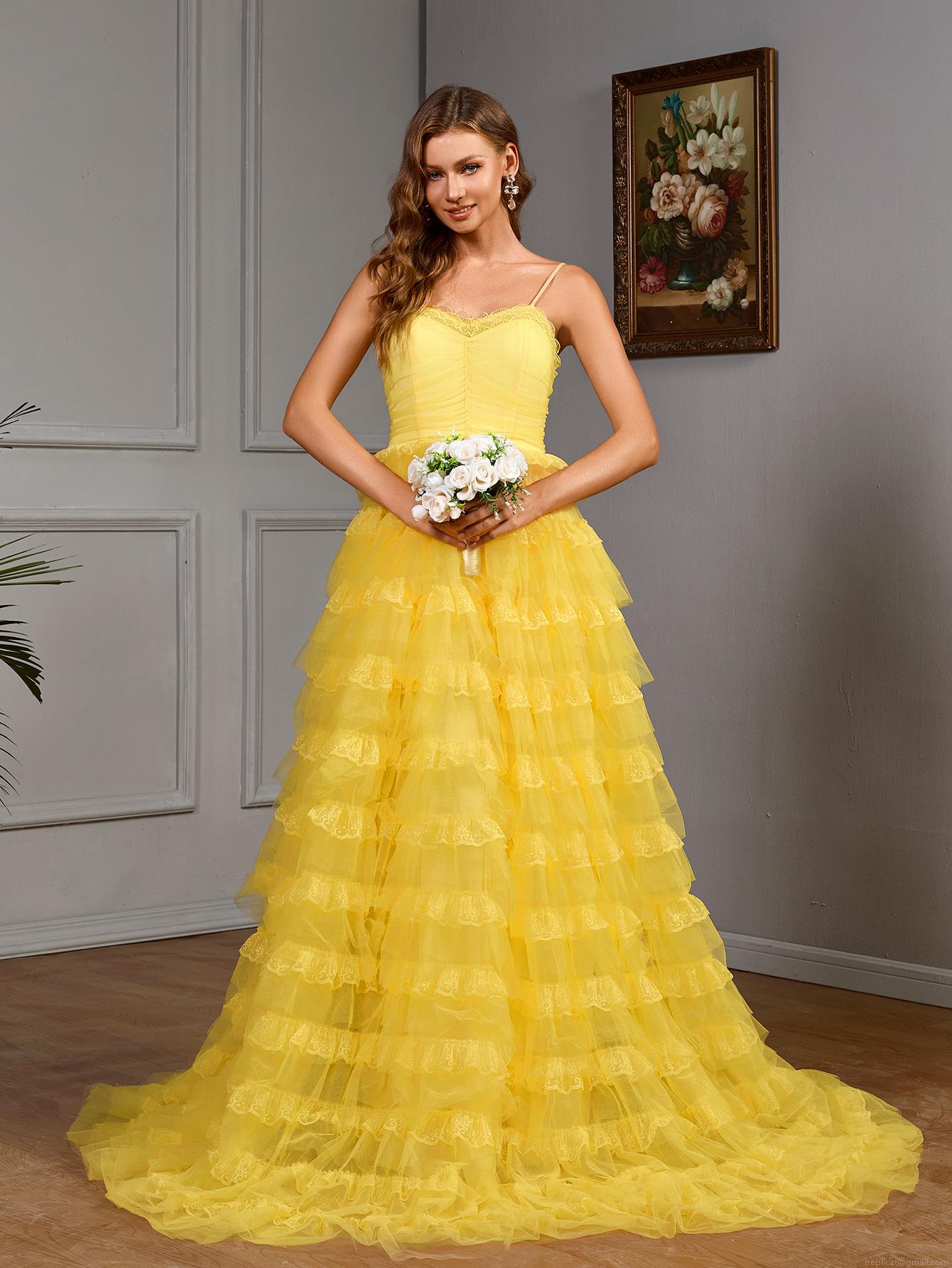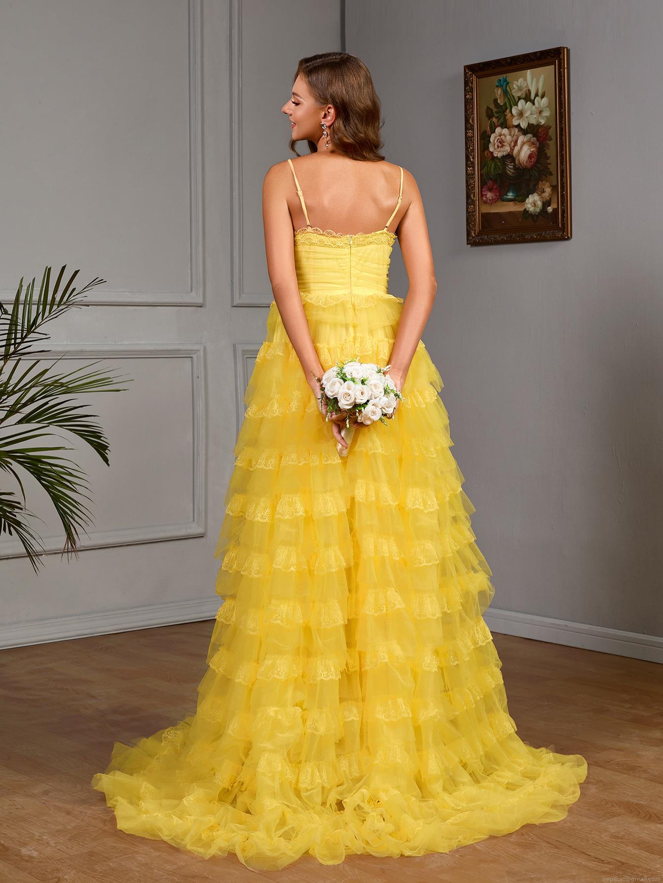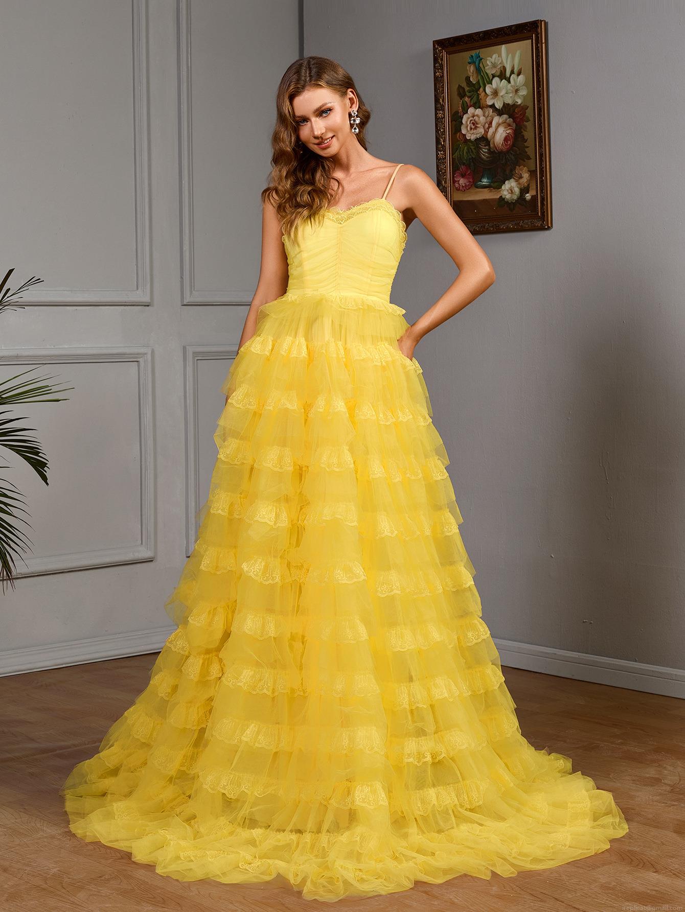 • Elegant Bright Yellow Lace Mesh Tiered Maxi Dress Sexy Backless V-Neck Spaghetti Strap A-Line Evening Party Gown For Women