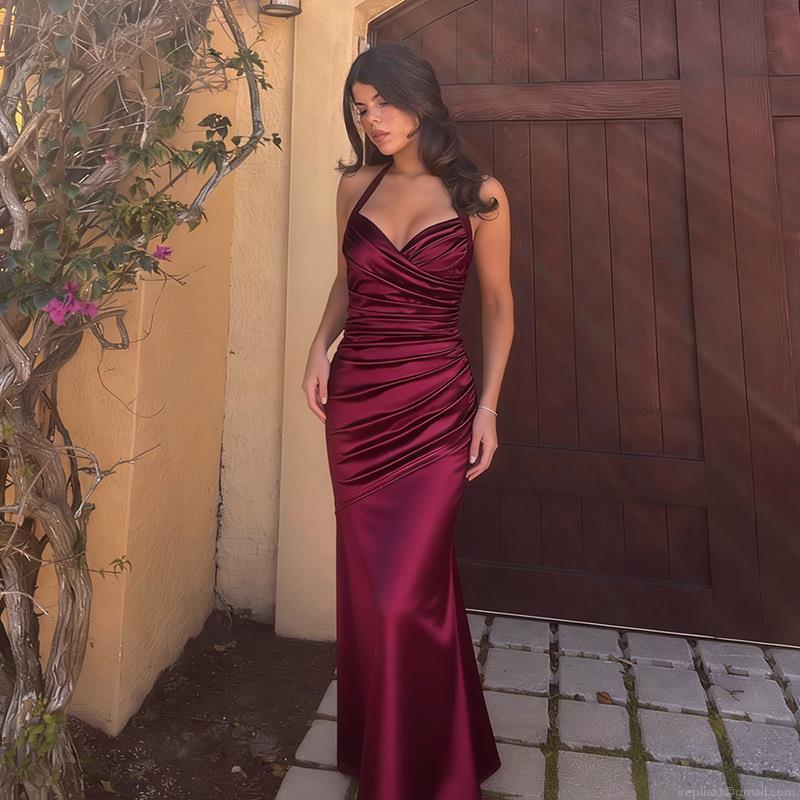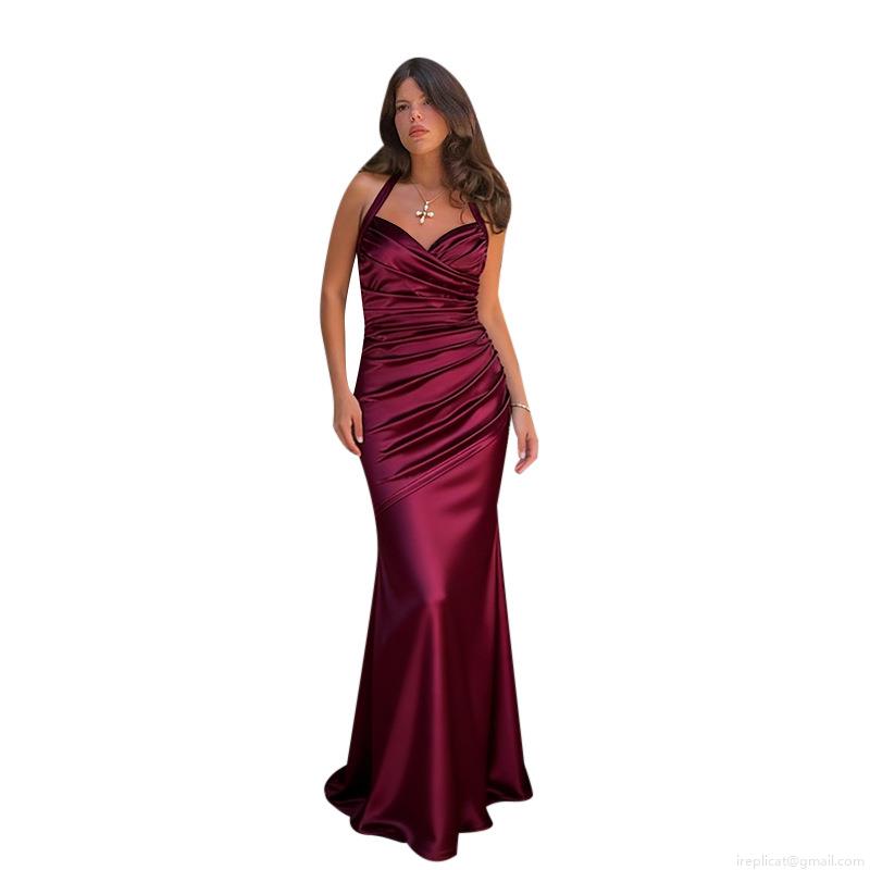 • Elegant Burgundy Satin Halter Neck Evening Gown Women Sexy Ruched Backless Fishtail Maxi Dress For Wedding Banquet Party Prom Event Formal Occasion