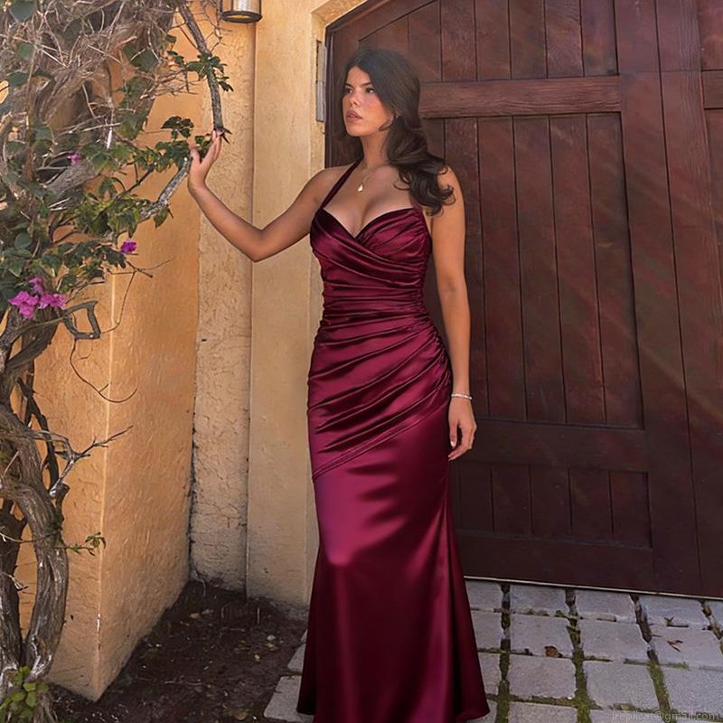 Elegant Burgundy Satin Halter Neck Evening Gown Women Sexy Ruched Backless Fishtail Maxi Dress For Wedding Banquet Party Prom Event Formal Occasion