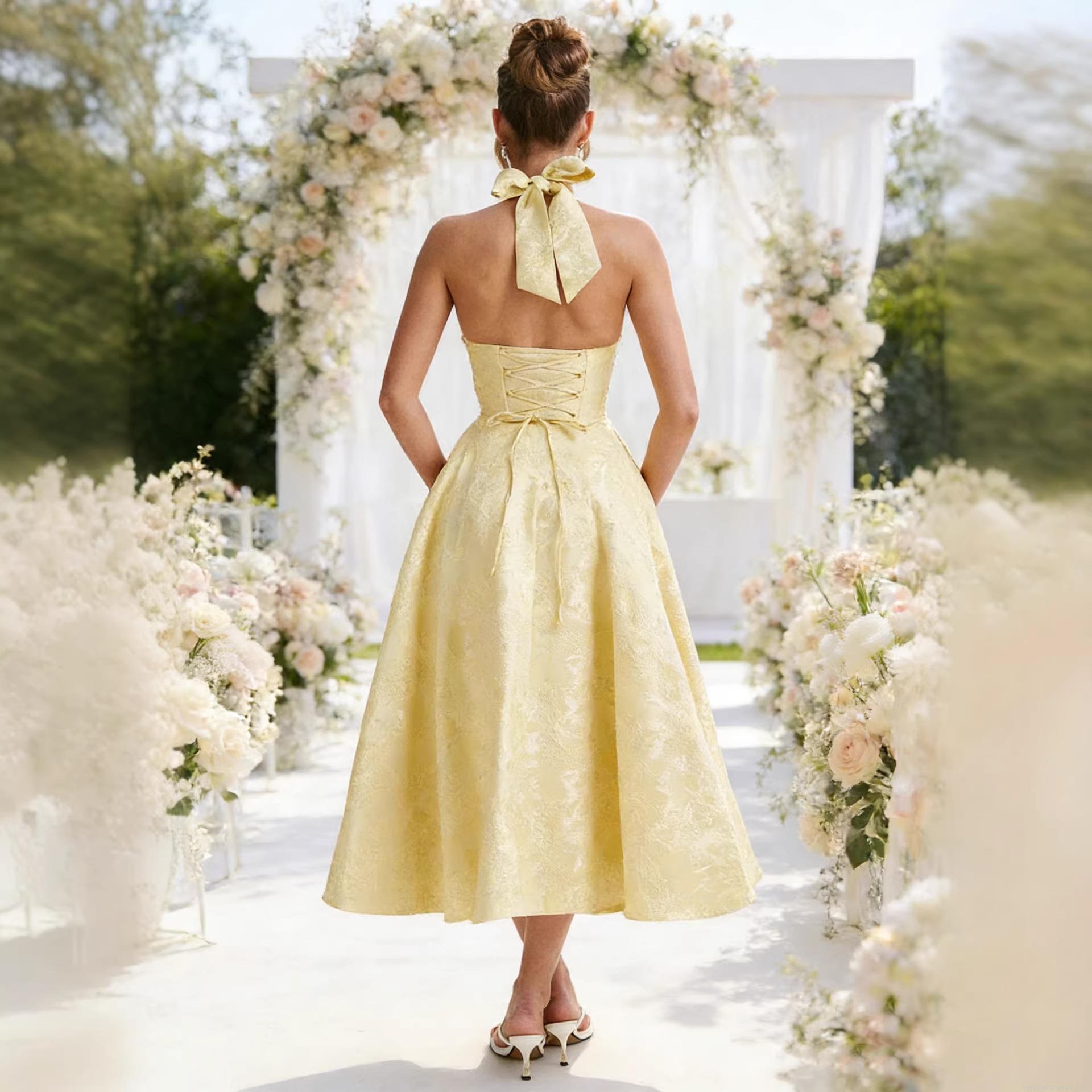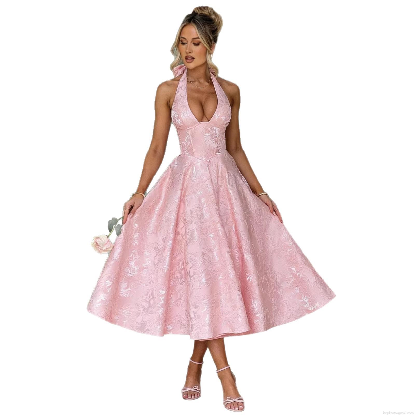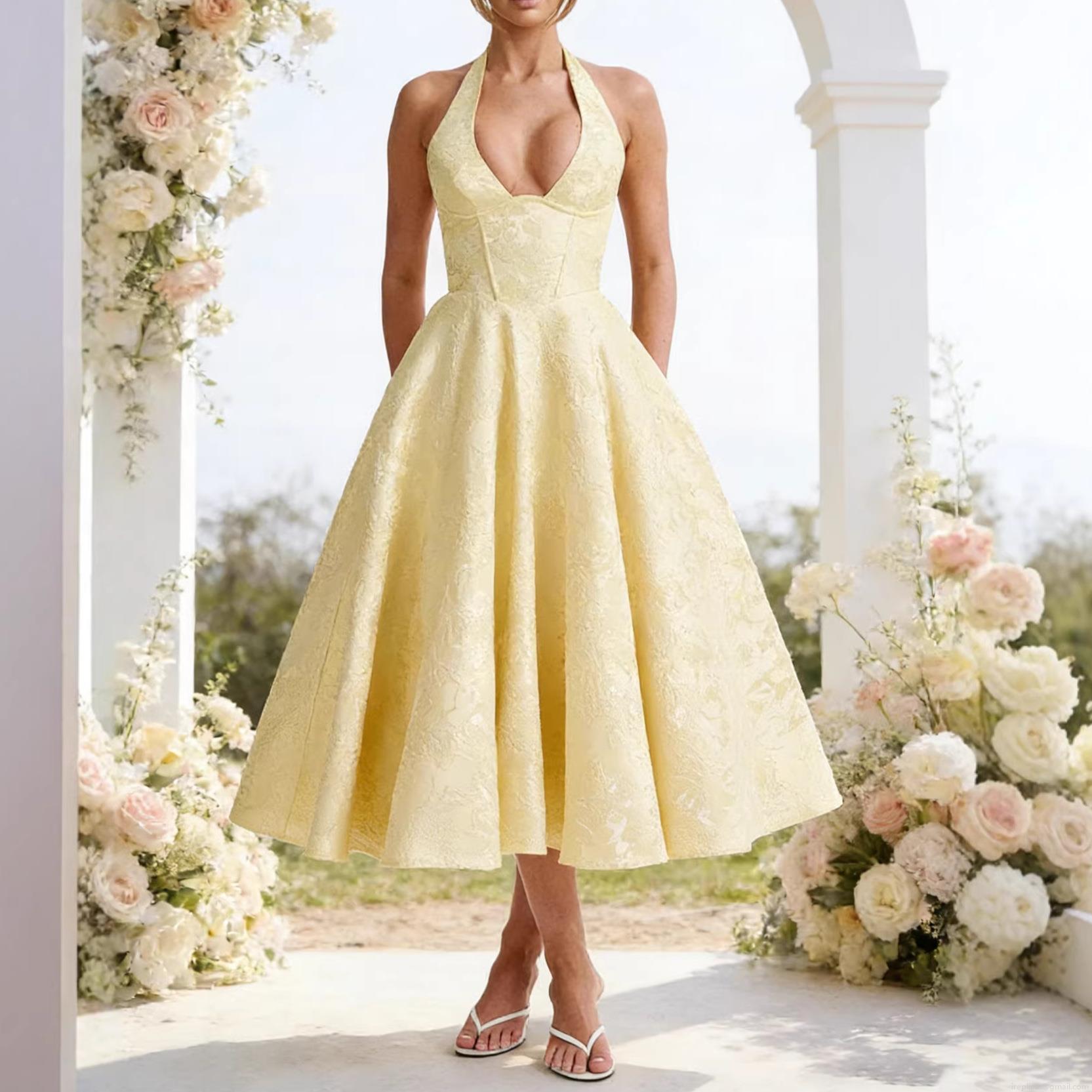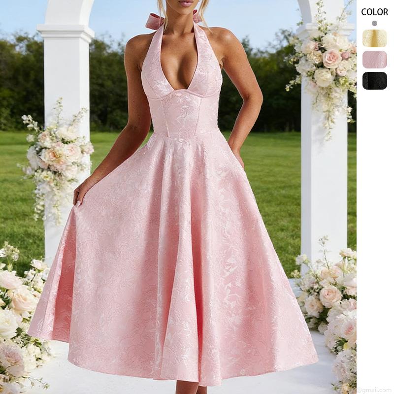 Elegant French Style Women's Jacquard Halter Midi Dress Deep V-Neck Backless Lace-up Large Swing A-Line Evening Party Wedding Vacation Dress
