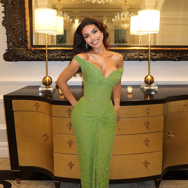 Elegant Green Sequin Polyester Spandex Evening Gown Women Sexy Off-Shoulder Mermaid Maxi Dress For Wedding Party Gala Special Occasion Night Club Wear